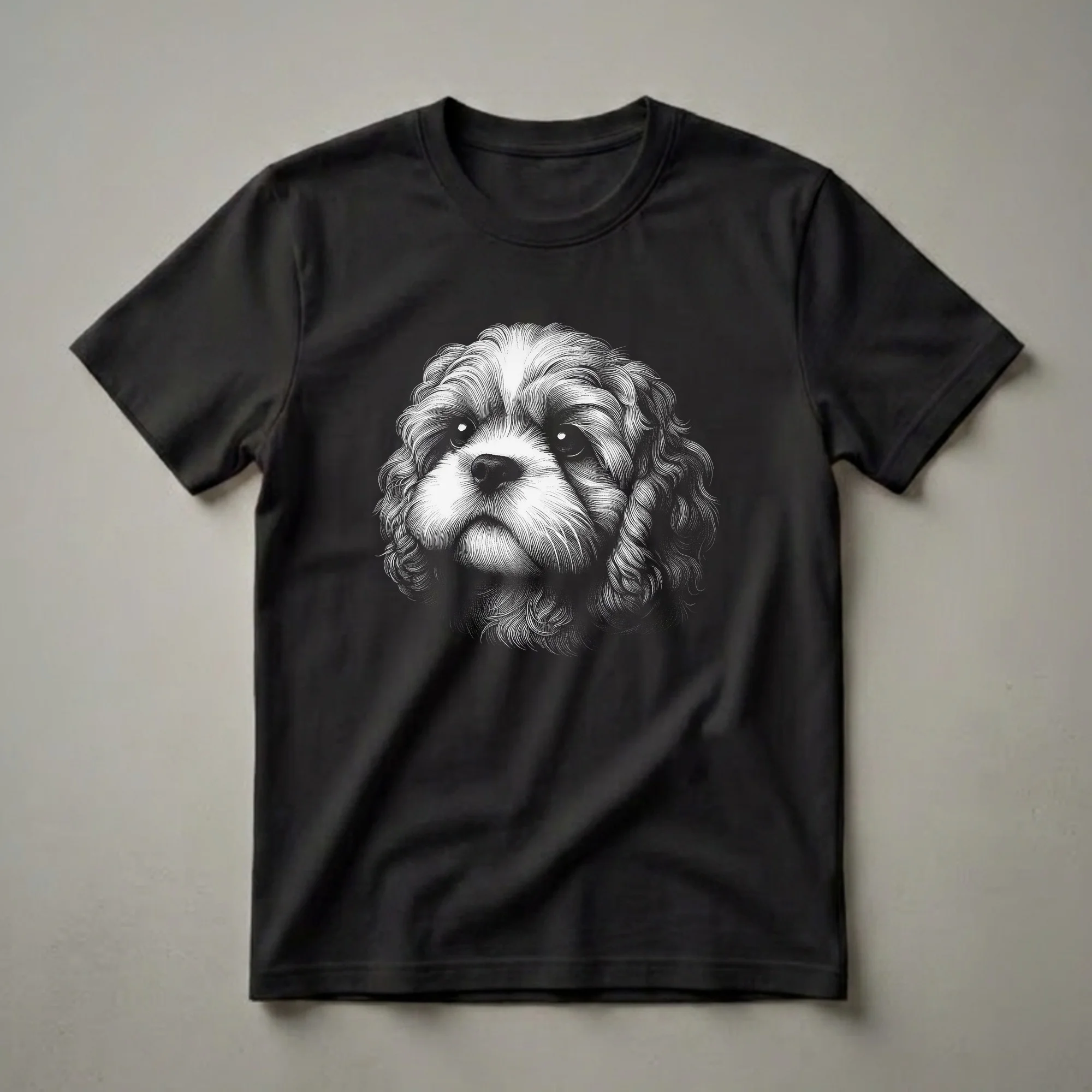 Cavachon owners who appreciate detailed artistry will adore this unique graphic tee. The design features a striking, close-up illustration of a Cavachon dog's face rendered in a scratchboard style, with intricate lines creating a sense of depth and texture. The dog's expressive eyes and soft, wavy fur are captured with remarkable detail against the stark black background, making the artwork pop. Cavachons, a crossbreed between the Cavalier King Charles Spaniel and the Bichon Frise, are known for their affectionate and playful nature, often described as 'velcro dogs' due to their desire to be close to their owners. This t-shirt serves as a wonderful way to celebrate that special bond. It makes a thoughtful gift for any Cavachon mom or dad, a thoughtful choice for casual outings, dog park visits, or simply relaxing at home. This eye-catching shirt is a staple for anyone looking to express their passion for this charming breed, offering comfort and style.