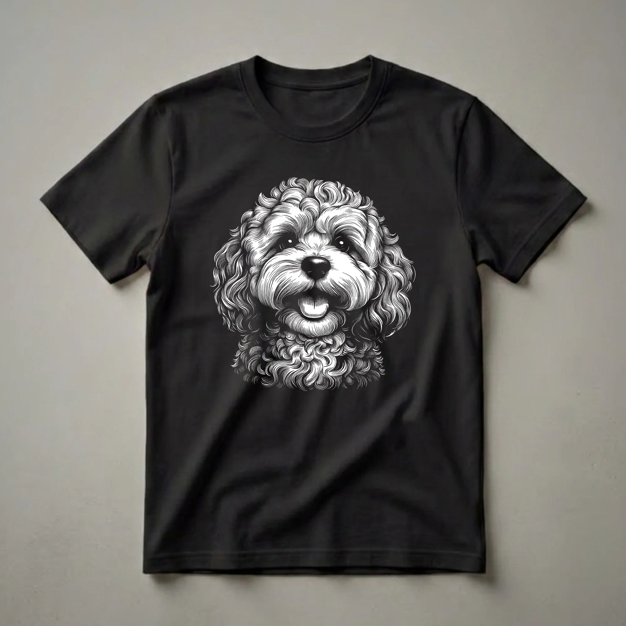 Showcase your devotion to your Cavapoo with this striking black and white graphic t-shirt featuring a detailed line-art portrait of the beloved dog breed.This graphic tee features a detailed, scratchboard-style illustration of a Cavapoo's face, capturing the breed's characteristic curly coat and friendly expression. The intricate linework brings the dog's features to life, from its perky ears to its panting tongue. Cavapoos, a crossbreed between a Cavalier King Charles Spaniel and a Poodle, are known for their playful nature and hypoallergenic coats, making them a popular choice for families. This shirt is a staple in the collection for any proud Cavapoo mom or dad. It makes a thoughtful gift for birthdays, holidays, or just because. Wear this eye-catching t-shirt to your next dog park visit or casual outing and let your canine pride shine through. This apparel is a go-to tee for anyone who cherishes their furry friend.