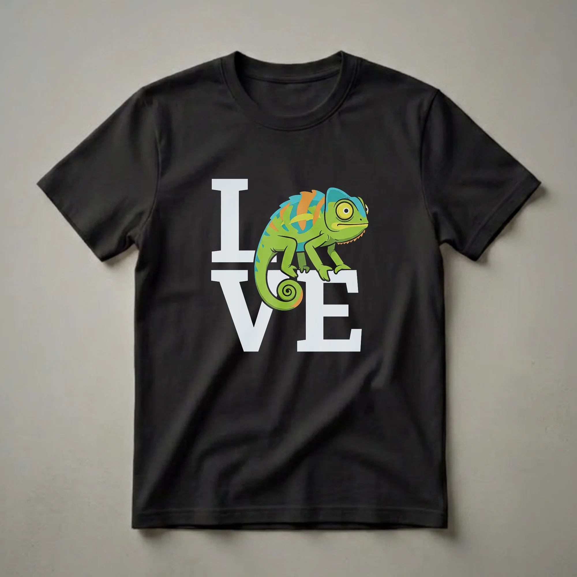 Reptile lovers who appreciate the unique beauty of chameleons will reach for this striking graphic tee. The design features a vibrant, stylized chameleon perched atop the large, light grey letters spelling out 'LOVE'. The chameleon itself is depicted in shades of green, blue, and orange, with its characteristic large eyes and coiled tail. Chameleons are fascinating lizards known for their incredible ability to change color, their independently moving eyes, and their prehensile tails, which they use for gripping branches. These adaptations allow them to thrive in diverse habitats across Africa, Europe, and Asia, from rainforests to deserts. This shirt is a thoughtful gift for anyone who keeps chameleons as pets or simply admires these remarkable creatures. It's a great way to express your passion for herpetology and unique wildlife. Wear this tee to your next reptile expo, a casual outing, or simply while relaxing at home, showcasing your affection for these captivating reptiles.