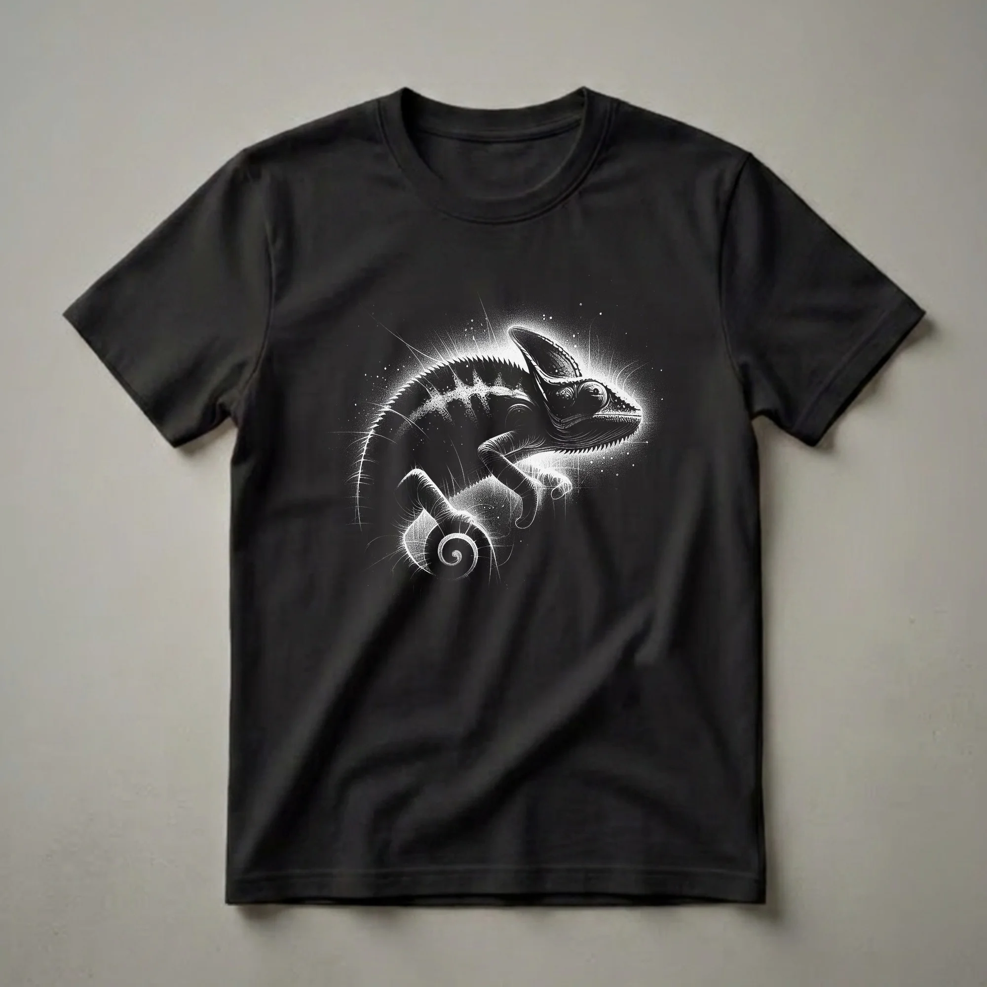 Reptile enthusiasts and keepers of lizards will reach for this striking chameleon graphic tee. The artwork places a chameleon in a detailed profile view, coiled tail spiraling inward, crest raised, eye prominently alert, surrounded by a blazing white radiant aura of light rays and glittering spark streaks that burst outward against the black background. The contrast between the dark-toned chameleon body and the luminous aura makes the design feel charged with energy. Chameleons belong to the family Chamaeleonidae and comprise over 200 species found primarily in sub-Saharan Africa and Madagascar, with a few species in the Middle East, southern Europe, and South Asia. Their famous color-changing ability is not primarily for camouflage but is controlled by layers of specialized cells called iridophores that shift nanocrystal spacing in response to mood, temperature, and social communication. Veiled chameleons (Chamaeleo calyptratus) and panther chameleons (Furcifer pardalis) are among the most popular species in the reptile-keeping hobby. This shirt makes a thoughtful gift for men or women who keep chameleons, study herpetology, or simply appreciate the extraordinary biology of lizards. Wear this eye-catching tee to reptile expos, nature events, or any casual outing where a bold graphic makes a statement. The radiant aura treatment gives this lizard design a mythic quality that elevates it beyond a simple nature print.