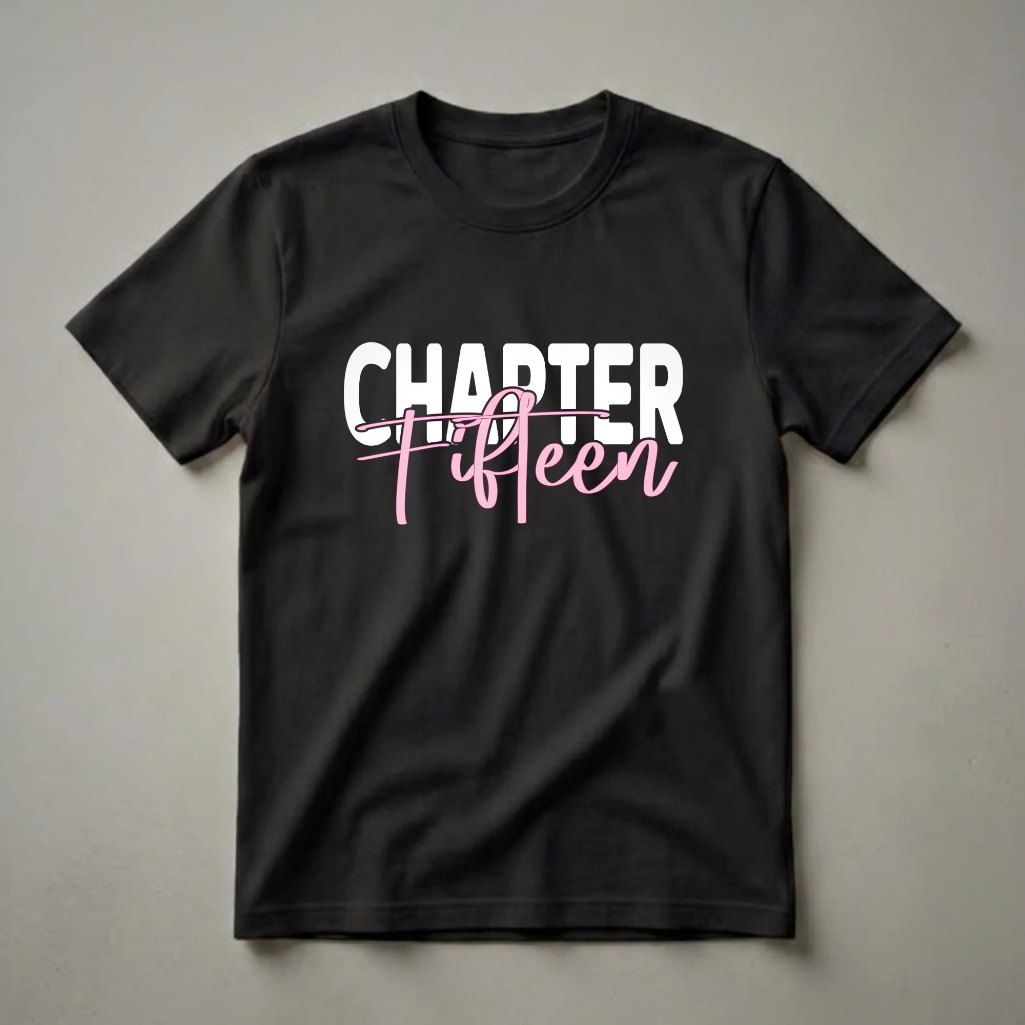 Turning fifteen is a significant milestone, marking a transition into a new chapter of life. This graphic tee captures that excitement with bold typography. The word 'CHAPTER' is presented in clean, white, uppercase block letters, signifying a new beginning. Beneath it, 'Fifteen' is written in a flowing, vibrant pink script, adding a touch of personal style and celebration. This t-shirt is a thoughtful gift for any girl celebrating her 15th birthday, whether it's for a birthday party, family gathering, or just to wear as she embraces this exciting age. It's a staple piece for any tween or teen's wardrobe during their fifteenth year. This shirt works well for girls who want to showcase their birthday pride with a stylish and memorable design. Wear it to your birthday brunch or a special celebration to make the day even more memorable.
