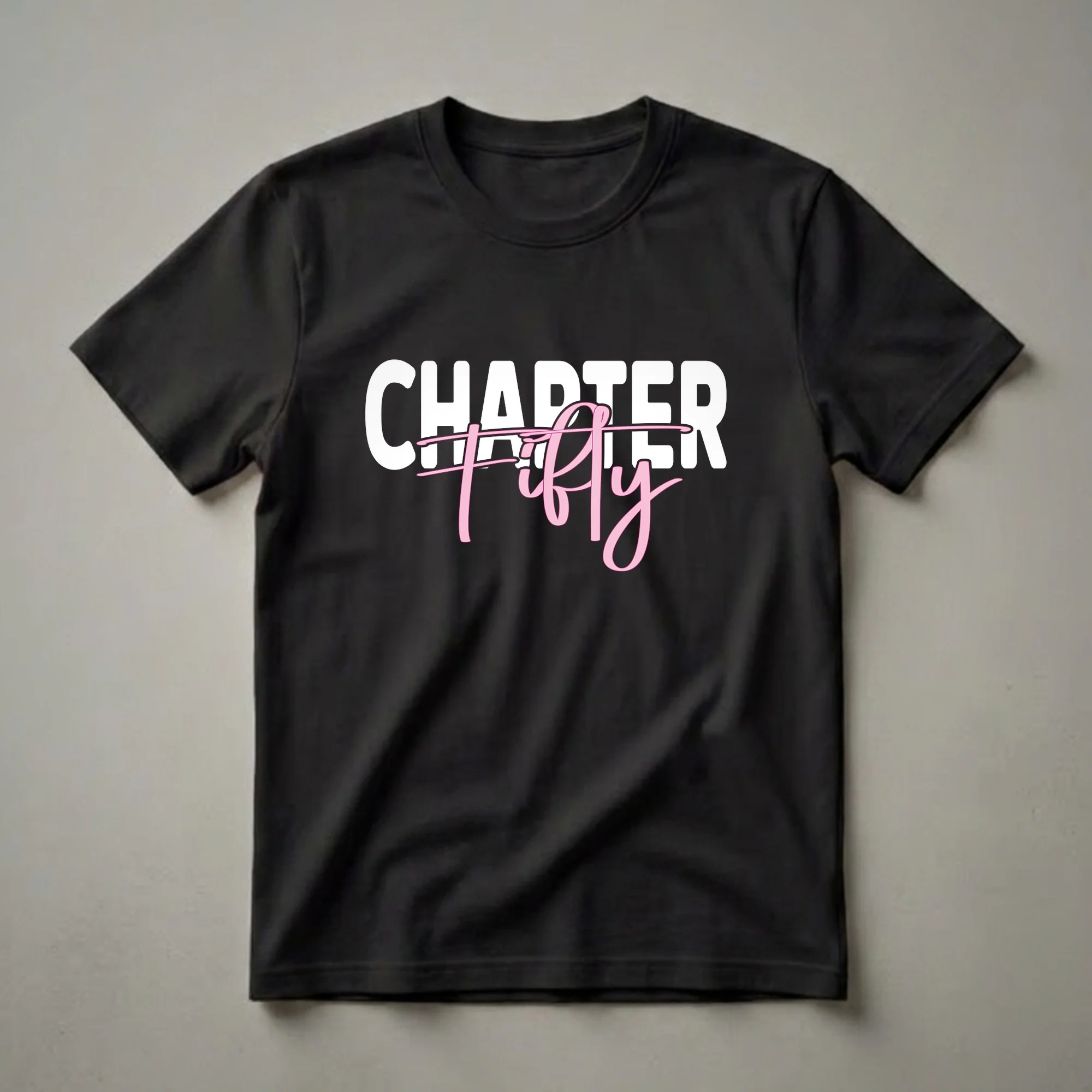 - "Chapter Fifty" graphic t-shirt for women celebrating their 50th birthday.
