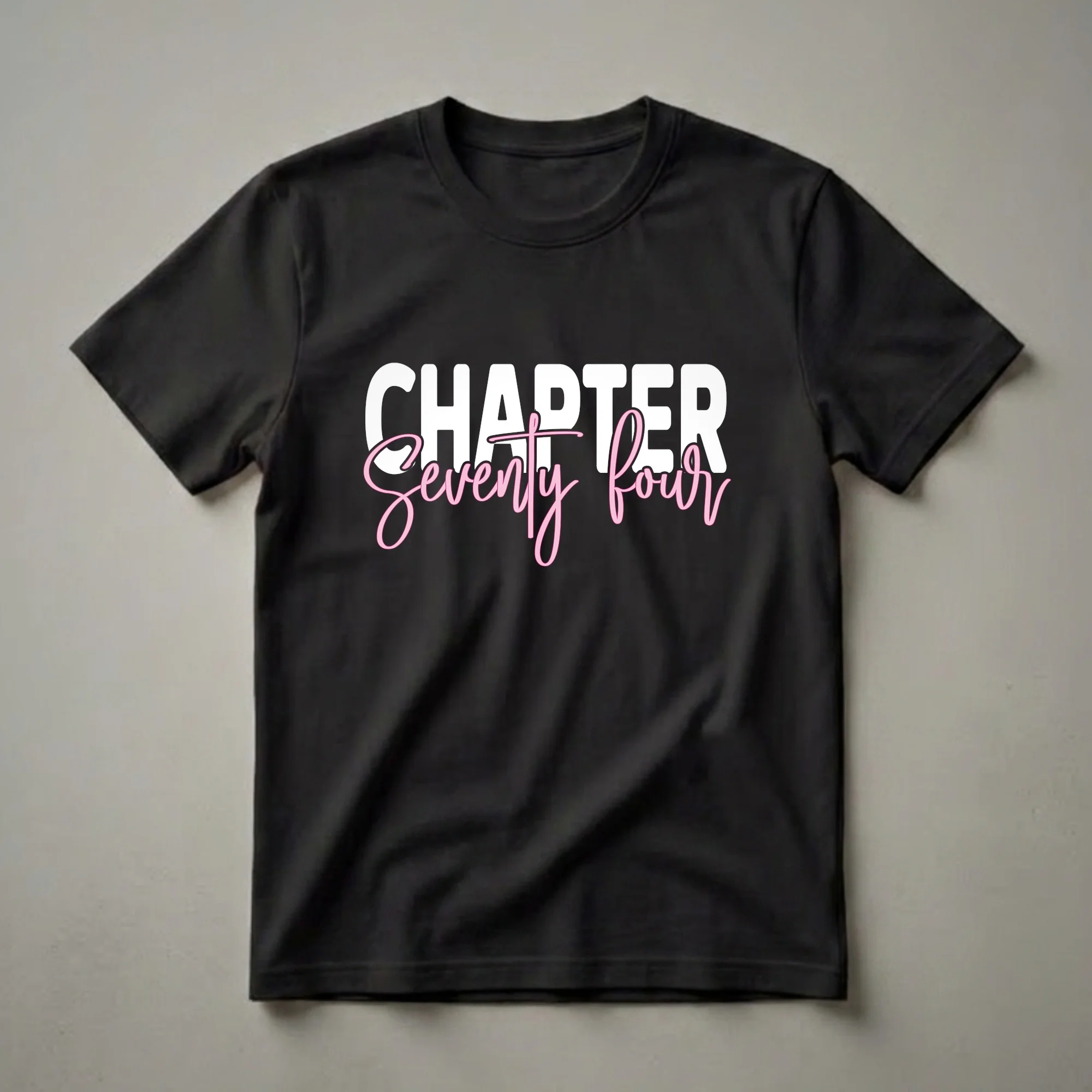 - "Chapter Seventy Four" graphic tee for women celebrating their 74th birthday.