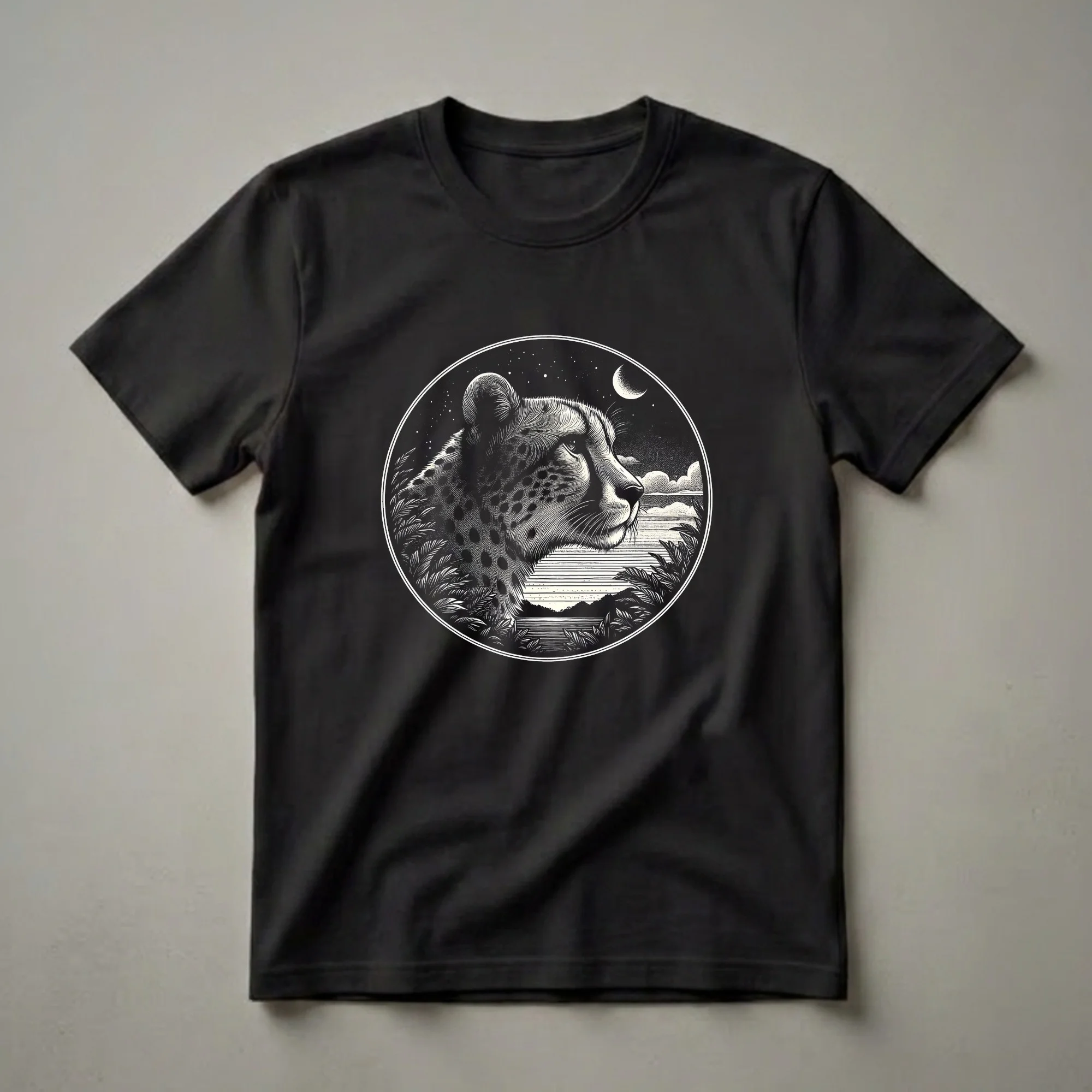 Wildlife enthusiasts and nature lovers will reach for this unique cheetah graphic tee. The striking design captures a cheetah in profile against a dramatic night sky, complete with a crescent moon and scattered stars. Lush foliage frames the scene, leading the eye to a serene body of water reflecting the celestial display and distant hills. Cheetahs, known for their incredible speed and distinctive spotted coats, are solitary hunters native to Africa and parts of Iran. This t-shirt is a thoughtful gift for anyone who appreciates the beauty and majesty of these magnificent big cats. Wear this shirt on your next hike, to a nature documentary screening, or simply as a conversation starter that highlights your passion for the wild. It's a staple for any wardrobe focused on celebrating the natural world and its inhabitants. This apparel offers a unique way to connect with the untamed spirit of the cheetah.