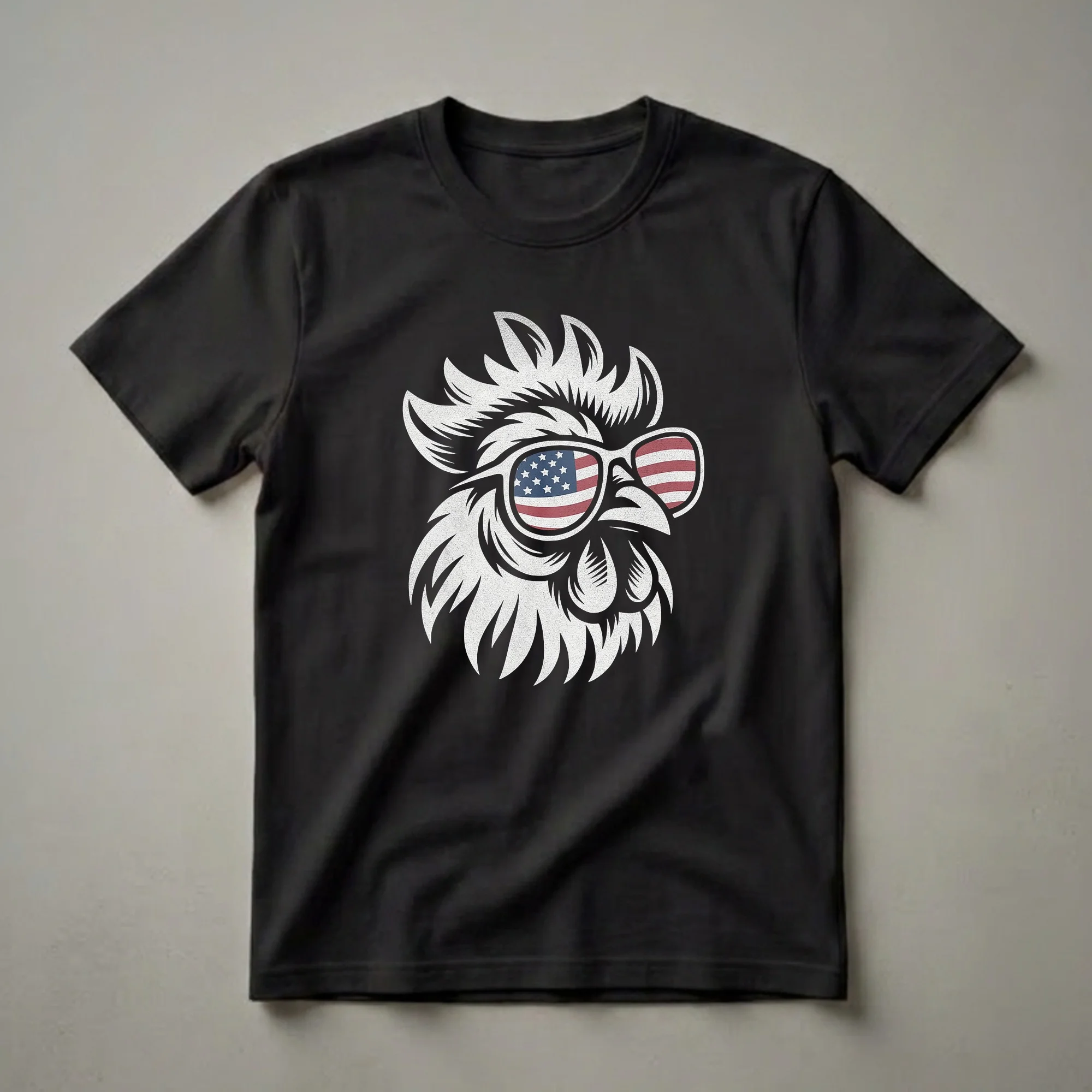 Proud Americans who want to showcase their national pride will reach for this striking graphic tee. The design features a stylized white chicken head with a textured, distressed look. This fowl is sporting cool sunglasses, and the lenses reflect a vibrant American flag, complete with stars and stripes. The bold black outlines and the gritty texture give this design a vintage, retro feel, making it stand out. Chickens, known for their role in agriculture and as common farm animals, are represented here with a patriotic twist. This shirt is a thoughtful gift for veterans, active military personnel, or anyone who loves the USA and wants to express their patriotism. Wear this t-shirt to Fourth of July celebrations, Memorial Day parades, or any casual gathering where you want to display your American pride. It's a staple in any collection for those who celebrate freedom and the red, white, and blue.