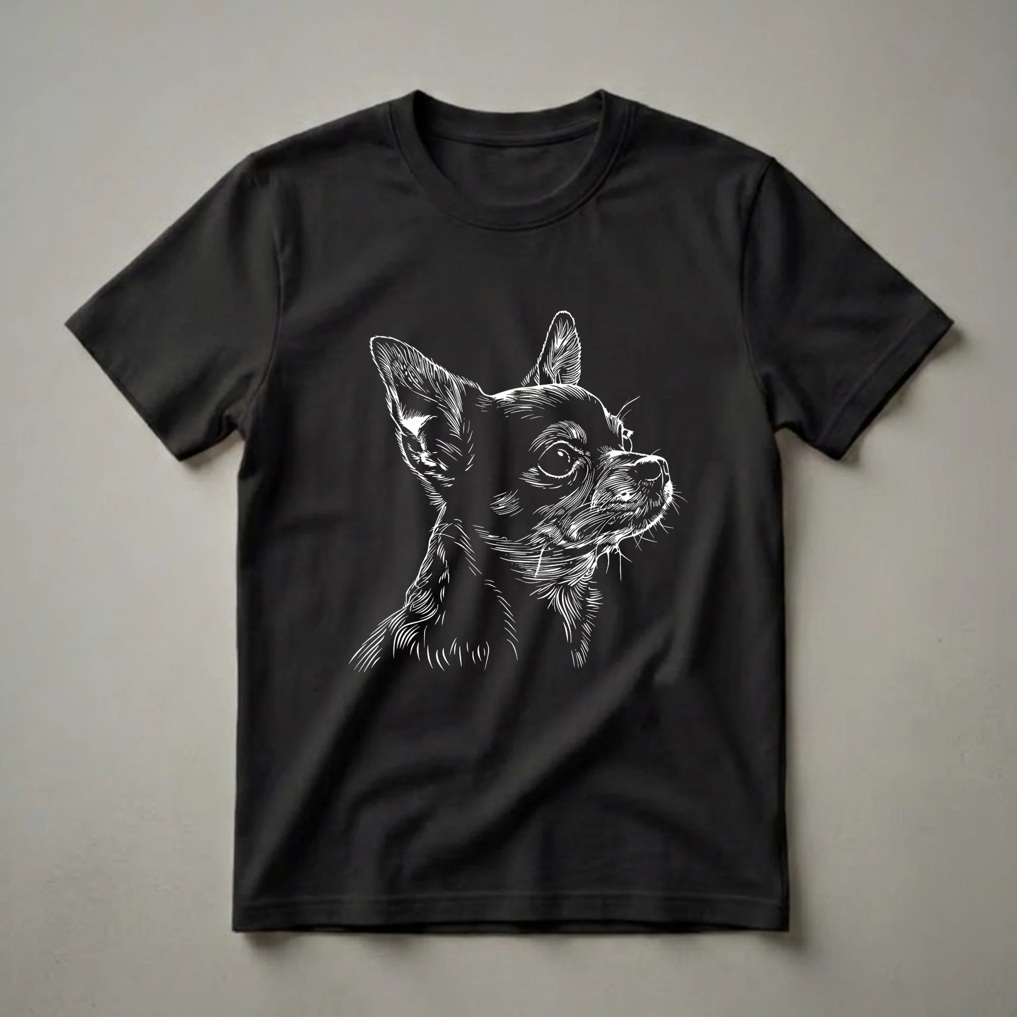 Showcase your love for the smallest dog breed with this striking Chihuahua line art graphic tee. This graphic tee features a detailed white line art illustration of a Chihuahua's face, capturing its alert ears and expressive eyes. The minimalist style, rendered with fine lines against a solid black background, gives this shirt an artistic and sophisticated feel. Chihuahuas, originating from Mexico, are known for being the smallest dog breed and possess a surprisingly bold temperament. This t-shirt is a thoughtful gift for any woman who cherishes her Chihuahua, whether she's a dedicated dog mom or simply admires the breed's unique charm. It's a go-to tee for casual outings, dog park visits, or relaxing at home with her furry companion. The striking visual makes it a conversation starter among fellow dog lovers. This shirt is a staple for anyone wanting to display their affection for their tiny, mighty canine friend, making it a truly special piece of apparel.