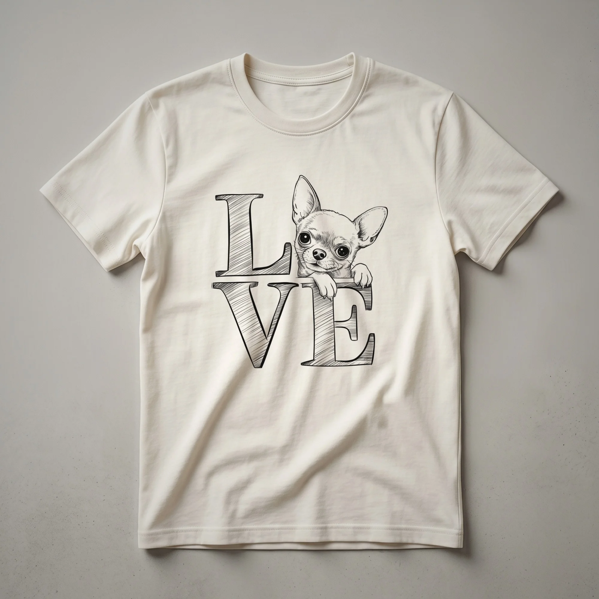 - Graphic t-shirt featuring a stylized Chihuahua head with floral details.