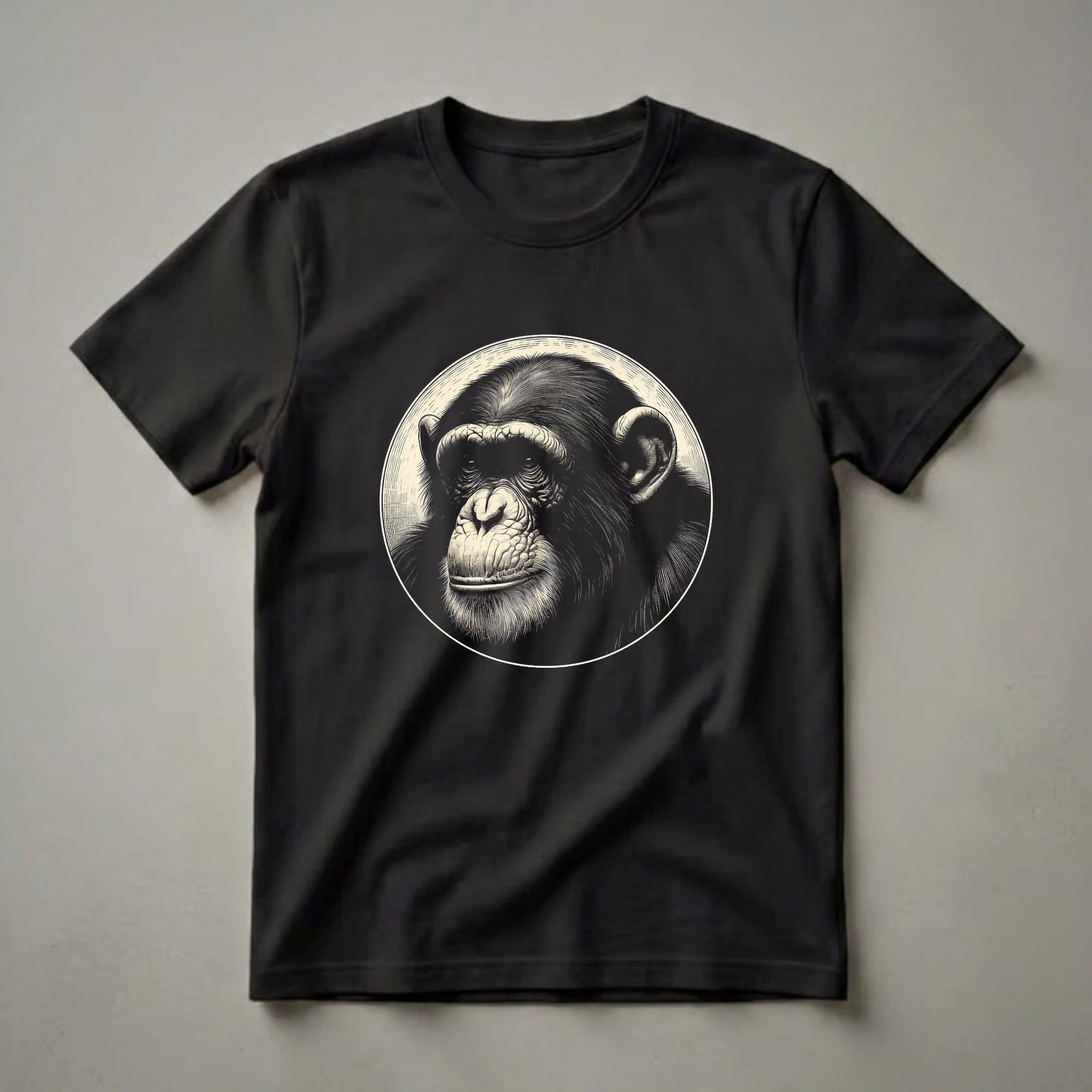 Chimpanzee enthusiasts will appreciate the intricate detail of this graphic tee, featuring a realistic portrayal of a chimpanzee's head. The artwork is rendered in a classic, monochromatic style with fine linework, creating a striking visual that captures the intelligent gaze and textured features of the primate. Chimpanzees, known for their complex social structures and tool use, are fascinating creatures native to the forests of equatorial Africa. This shirt is a thoughtful gift for anyone who admires these intelligent animals or has a passion for wildlife conservation. It's a go-to tee for casual outings, hikes in nature, or simply relaxing at home while celebrating your connection to the natural world. Wear this unique chimpanzee shirt to spark conversations about primate behavior and the importance of protecting their habitats. This apparel is a staple for those who want to display their appreciation for the animal kingdom.