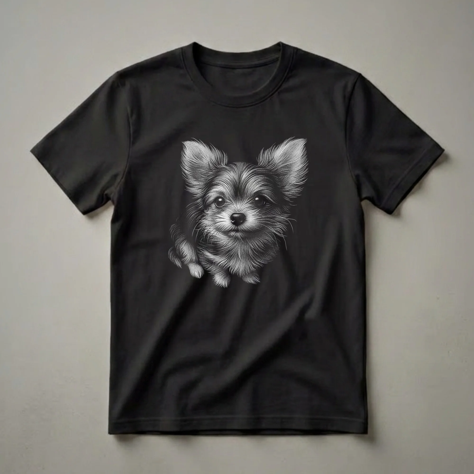 Chorkie owners who appreciate unique canine art will reach for this eye-catching t-shirt. The design features a meticulously rendered sketch of a Chorkie dog's face, complete with its signature large, expressive ears and a fluffy coat depicted with fine, detailed linework. This art style creates a striking visual against the dark background, highlighting the dog's gentle eyes and curious expression. Chorkies, a charming crossbreed between a Chihuahua and a Yorkshire Terrier, are known for their small size and spirited personalities, often inheriting the loyalty of a Chihuahua and the feisty nature of a Yorkie. This graphic tee is a wonderful way for any Chorkie mom or dad to express their affection for their beloved pet. It makes a thoughtful gift for birthdays, holidays, or just because for the dog lover in your life. Wear this unique shirt to your next dog park visit or casual outing to spark conversations with fellow canine enthusiasts.