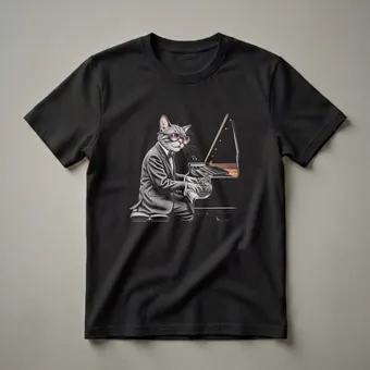 Cat lovers and piano enthusiasts will appreciate this striking graphic tee. The artwork depicts a dapper tabby cat, complete with stylish sunglasses and a formal tuxedo, seated at a grand piano. Its paws are poised over the keys, suggesting a moment of musical concentration, with musical notes floating in the air. The detailed drawing style brings this whimsical scene to life against a stark black background. Pianos, a cornerstone of Western music, have a rich history dating back to the early 18th century, evolving from harpsichords to the complex instruments we know today. This shirt is a thoughtful gift for any musician, piano student, or anyone who adores felines and fine art. It makes a thoughtful conversation starter at music recitals, jazz clubs, or casual gatherings. This t-shirt is a staple in the collection for those who appreciate a blend of humor and artistry. Wear it to your next practice session or simply to showcase your unique style.
