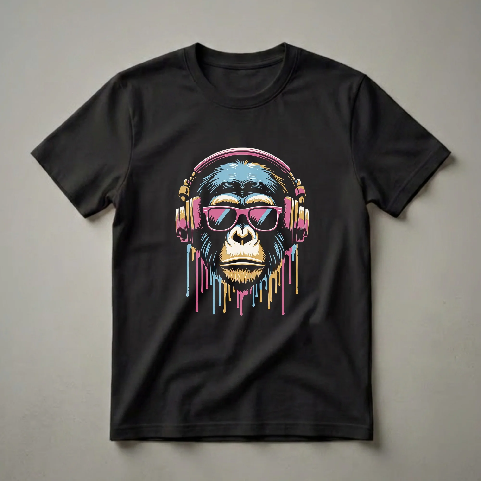 Rock a seriously cool vibe with this graphic t-shirt featuring a stylized chimpanzee sporting sunglasses and headphones amidst a vibrant paint drip design. This striking graphic tee captures a unique artistic interpretation of a chimpanzee, adorned with vibrant pink sunglasses and retro headphones. The design features a drip effect in pink, blue, and yellow, adding a pop of color and a modern edge to the woodland wildlife theme. Chimpanzees are highly social animals, often found in groups, and are known for their tool-use abilities, a trait that sets them apart in the animal kingdom. This t-shirt is a thoughtful gift for any wildlife enthusiast, nature lover, or someone who appreciates unique and eye-catching apparel. It's a great conversation starter and a way to express a cool, laid-back vibe. Wear this shirt to casual outings, music festivals, or simply when you want to showcase your appreciation for these incredible creatures and their natural habitat. This tee is a staple for anyone looking to add a touch of artistic flair to their wardrobe, celebrating the wild in a cool, contemporary style.