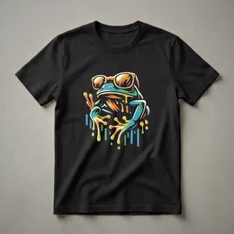 - Colorful frog graphic tee with bold street-art drip elements on a black shirt.