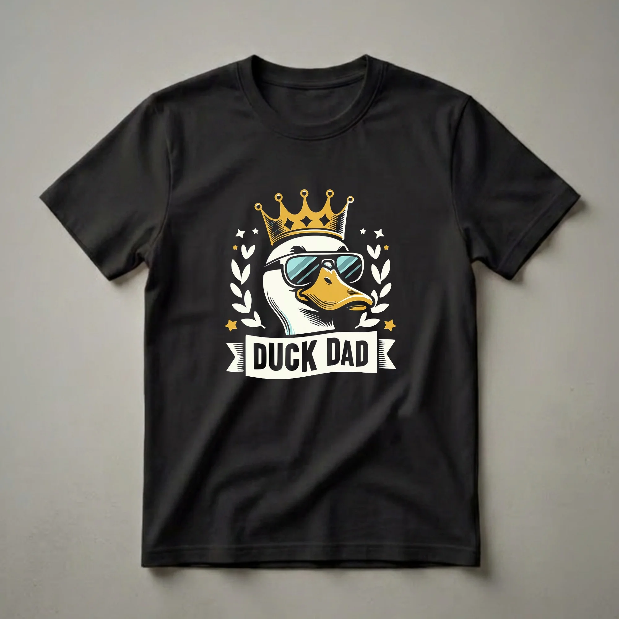 For the dad who rules the pond, this graphic tee proudly declares 'DUCK DAD' with a touch of regal flair. The design showcases a stylized duck, rendered in a bold, illustrative style, sporting cool blue-tinted sunglasses and a golden crown atop its head. Flanked by laurel-like branches and scattered stars, the artwork is set against a classic black background, making the vibrant elements pop. This shirt is a fantastic way for any father to express his love for his waterfowl companions or simply embrace a fun, quirky persona. Ducks, known for their adaptability and presence in various aquatic environments, are a beloved part of many rural and suburban landscapes. This t-shirt works well for dads who enjoy spending time outdoors, perhaps near lakes or ponds, or for those who simply appreciate a good laugh. It makes a thoughtful gift for Father's Day, birthdays, or any occasion where you want to celebrate the 'Duck Dad' in your life. He will reach for this tee when he wants to showcase his unique title with pride and a bit of swagger. Wear it to casual outings, family gatherings, or while tending to the backyard flock.