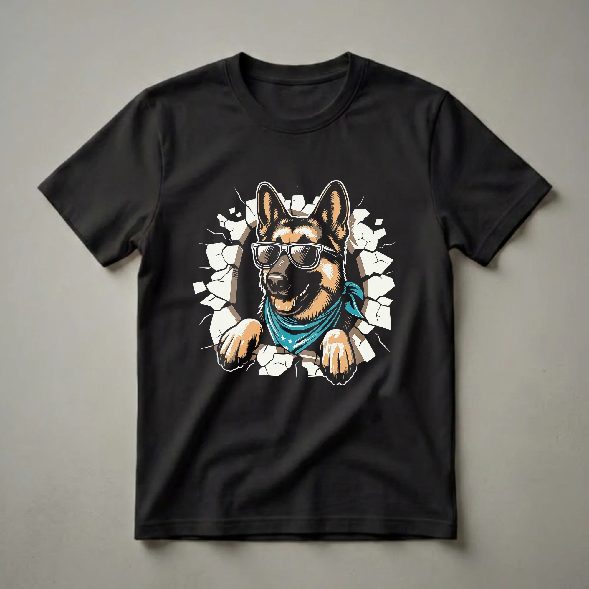 German Shepherd owners who appreciate their breed's intelligence and loyalty will reach for this striking graphic tee. The design showcases a German Shepherd emerging from a cracked wall, sporting cool sunglasses and a vibrant blue bandana adorned with white stars. This iconic breed, known for its versatility in roles from police work to family companionship, is captured here with a touch of patriotic flair. The cracked wall effect adds a dynamic, breaking-through element to the artwork, making it a real eye-catcher. This t-shirt works well for anyone who wants to display their affection for these noble dogs. It makes a thoughtful gift for the German Shepherd enthusiast in your life, especially for occasions like birthdays or holidays. Wear this shirt to casual outings, dog park visits, or while relaxing at home, letting your canine pride shine through. It's a staple for any dog lover's wardrobe, offering a unique way to celebrate your favorite breed.