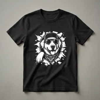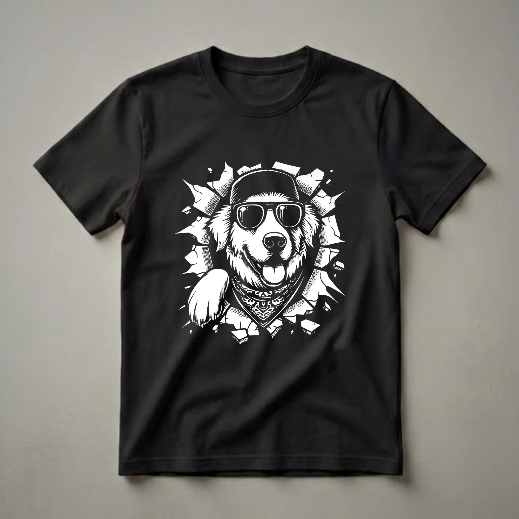 Show off your love for Golden Retrievers with this striking graphic t-shirt featuring a cool canine rocking shades and a bandana.This graphic tee captures that spirit with a cool Golden Retriever sporting stylish sunglasses and a patterned bandana, as if breaking through a wall. The striking black and white linework gives this design a classic, retro feel, reminiscent of vintage woodcut prints. This shirt is a fantastic way for any dog mom or dog dad to express their affection for their furry friend. It makes a thoughtful gift for birthdays, holidays, or just because. Wear this eye-catching t-shirt to casual outings, dog park visits, or while relaxing at home. It's a staple in the collection for any proud Golden Retriever parent who appreciates unique and stylish apparel. Let this tee be a conversation starter among fellow dog lovers.