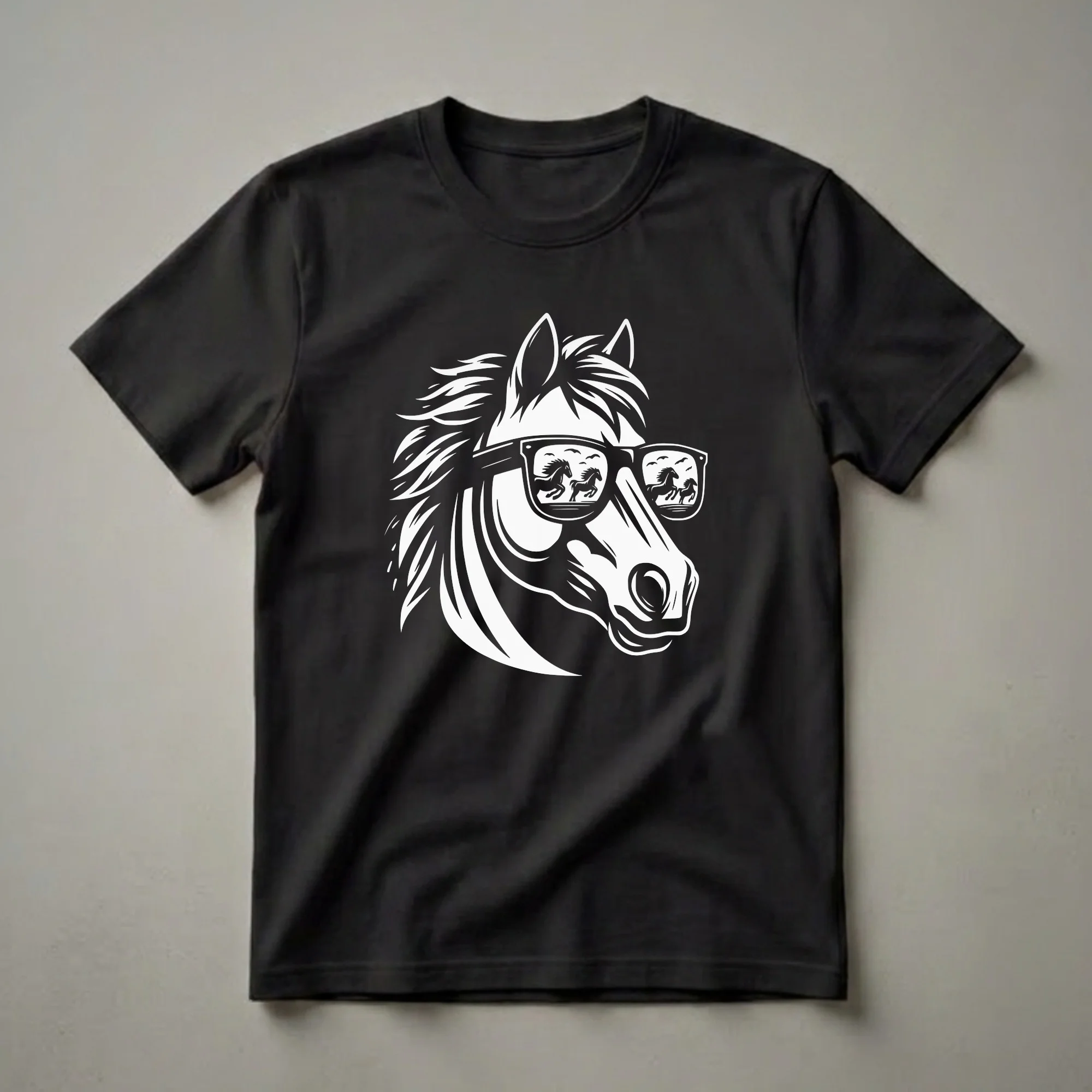 Equine enthusiasts who appreciate a touch of cool will reach for this striking graphic tee. The design features a stylized white illustration of a horse's head, complete with a flowing mane and a confident expression. What truly sets this shirt apart are the sunglasses worn by the horse, which reflect a scene of two horses galloping freely across a landscape, with birds soaring in the sky. This imagery evokes a sense of freedom and the wild spirit of these magnificent animals. Horses, known for their strength, grace, and historical partnership with humans, have long been symbols of power and beauty. This t-shirt is a thoughtful gift for anyone who adores horses, whether they are riders, trainers, or simply admire these majestic creatures from afar. It's a go-to tee for casual outings, equestrian events, or just relaxing at home, making a statement without saying a word. The bold graphic on a dark background ensures this shirt stands out, celebrating the enduring appeal of horses.