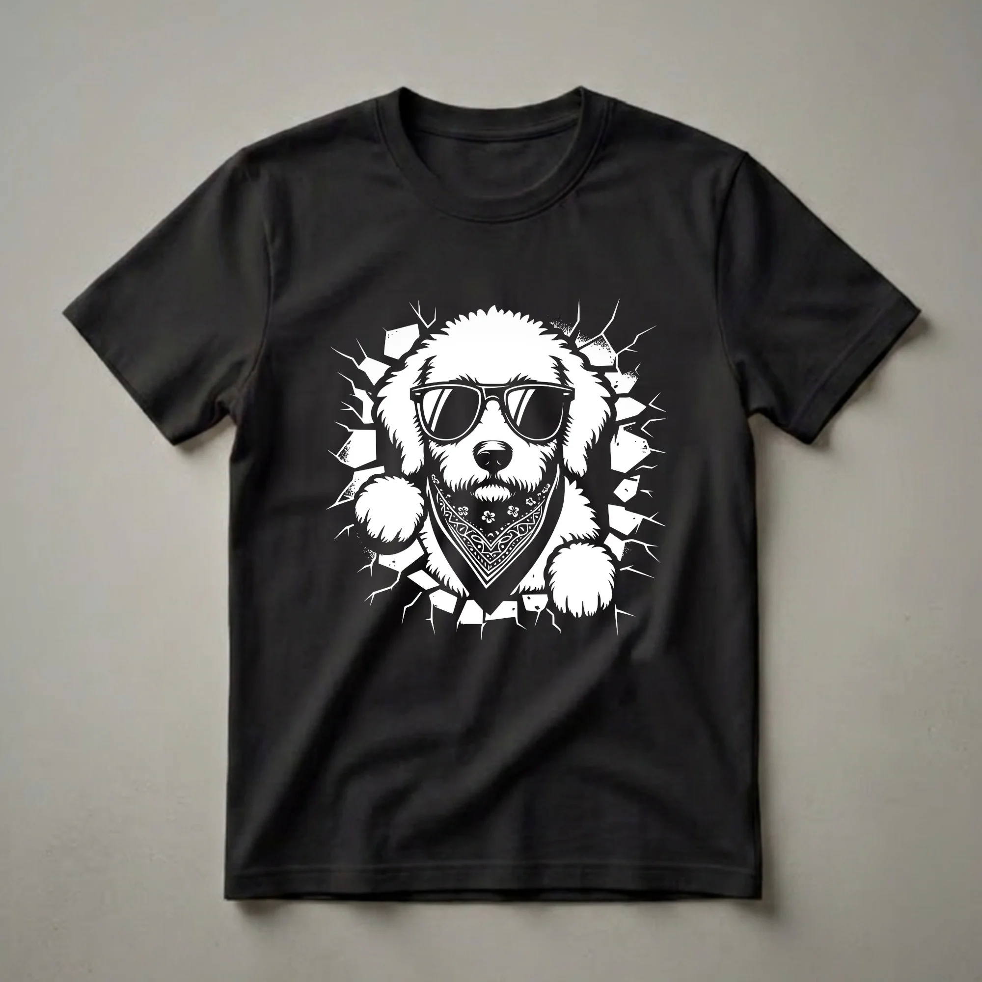 Labradoodle owners who appreciate a touch of cool will reach for this eye-catching graphic tee. The design showcases a fluffy white Labradoodle, instantly recognizable by its distinctive curly coat, sporting a pair of stylish sunglasses and a classic paisley bandana. This pup isn't just posing; it's bursting through a cracked background, adding an edgy, dynamic feel to the artwork. Labradoodles, known for their intelligence and friendly disposition, are a popular crossbreed, often celebrated for their hypoallergenic qualities and playful nature. This shirt captures that spirited personality with a bold, graphic statement. It’s a thoughtful gift for any Labradoodle mom or dad who wants to wear their canine pride. Imagine wearing this t-shirt to a casual outing, a dog park visit, or a relaxed weekend brunch. This tee is a fantastic way for any Labradoodle enthusiast to express their affection for their furry companion, making it a staple in their casual wardrobe.
