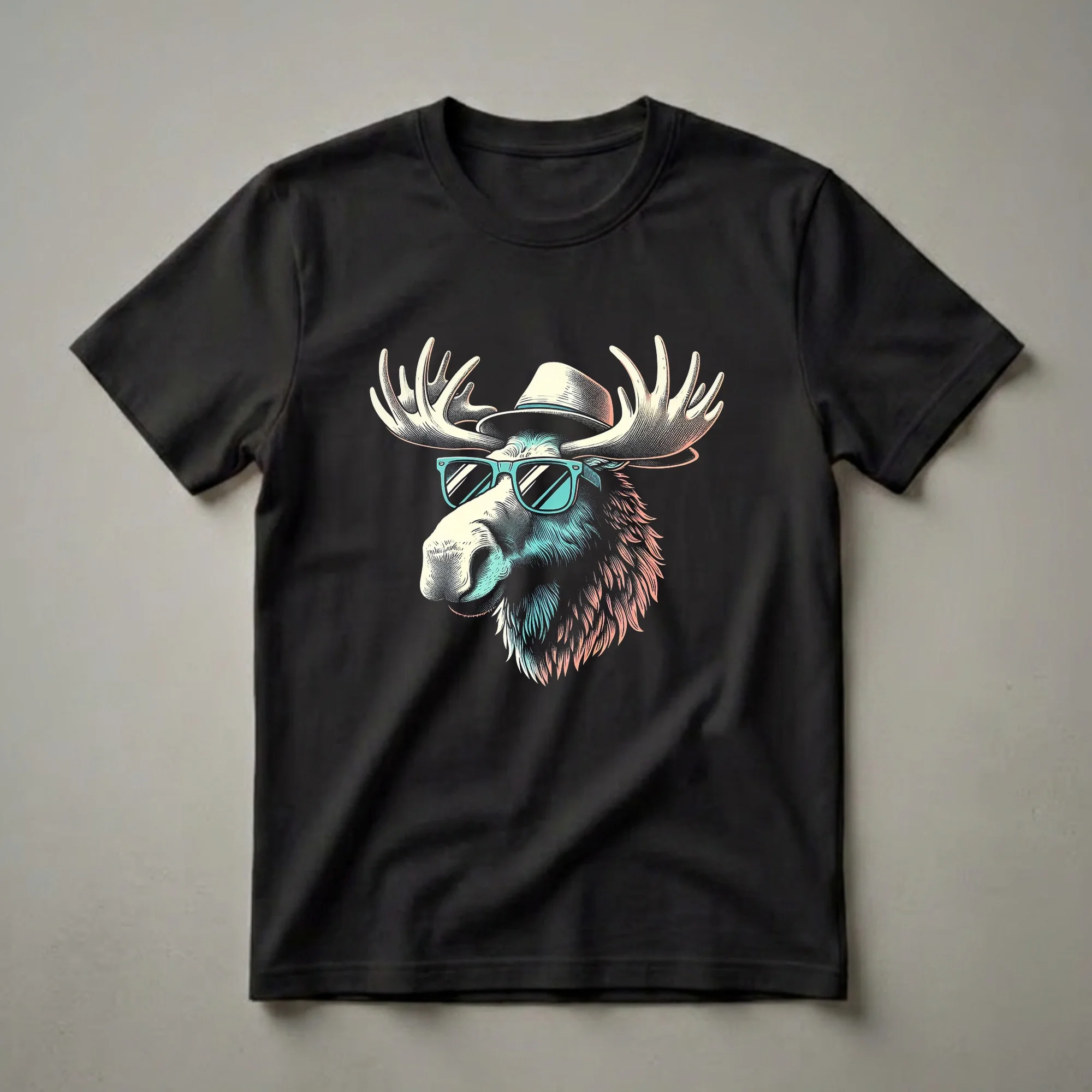 Moose enthusiasts and lovers of retro animal designs will appreciate this striking graphic tee. The artwork features a detailed illustration of a moose, complete with impressive antlers, sporting cool teal-tinted sunglasses and a classic fedora hat. The design utilizes a vintage halftone dot pattern and a limited color palette of cream, teal, and coral, giving it a distinct retro aesthetic. Moose, the largest members of the deer family, are known for their impressive size and solitary nature, often found in boreal forests and temperate broadleaf forests across North America and Eurasia. This shirt is a thoughtful gift for men and boys who appreciate wildlife with a touch of quirky style. It's a go-to tee for casual outings, outdoor adventures, or simply lounging around. Imagine wearing this eye-catching shirt to a casual gathering or while exploring nature trails. This t-shirt offers a unique way to express personality and a love for these magnificent creatures.