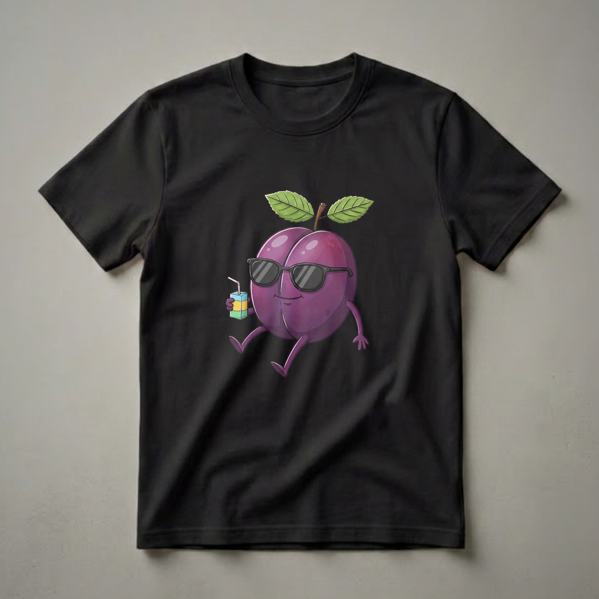 - Features a cool, cartoon plum character with sunglasses and a juice box.