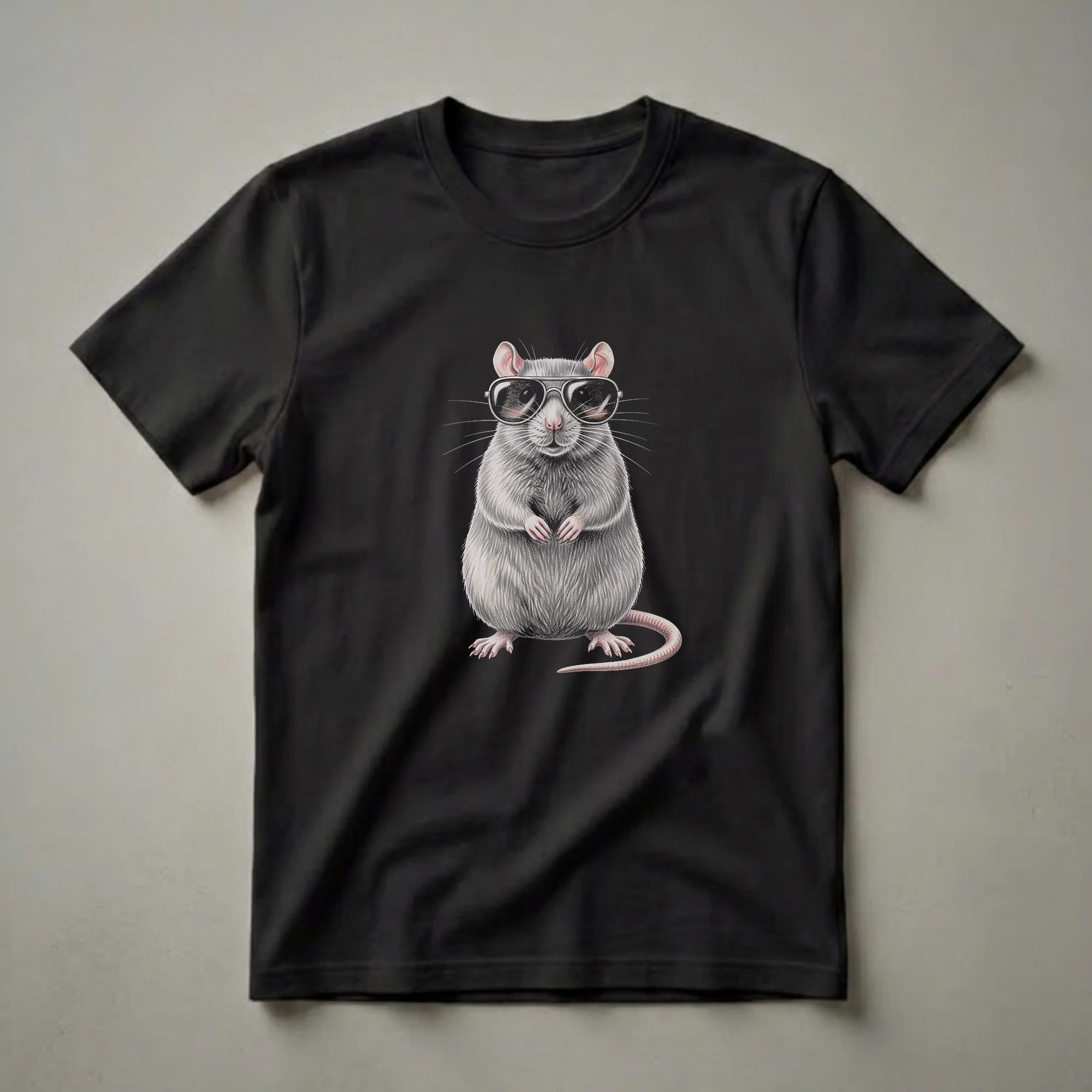 Wildlife enthusiasts and lovers of unique art will appreciate this striking t-shirt featuring a detailed drawing of a rat sporting cool aviator sunglasses. The artwork captures the rodent with its fur rendered in shades of grey and white, its pink ears and nose adding a touch of color, and its paws clasped neatly in front. Its long, segmented tail curls to the side, completing the realistic portrayal. Rats, known for their intelligence and adaptability, are found in diverse habitats worldwide, often thriving in urban environments as well as natural settings. This graphic tee is a fantastic way for someone who admires these often-misunderstood creatures to express their personality. It makes a thoughtful gift for the wildlife artist in your life or for anyone who enjoys a touch of whimsy in their wardrobe. Wear this shirt to casual outings, nature walks, or to express your appreciation for unconventional animal art. This apparel is a conversation starter.