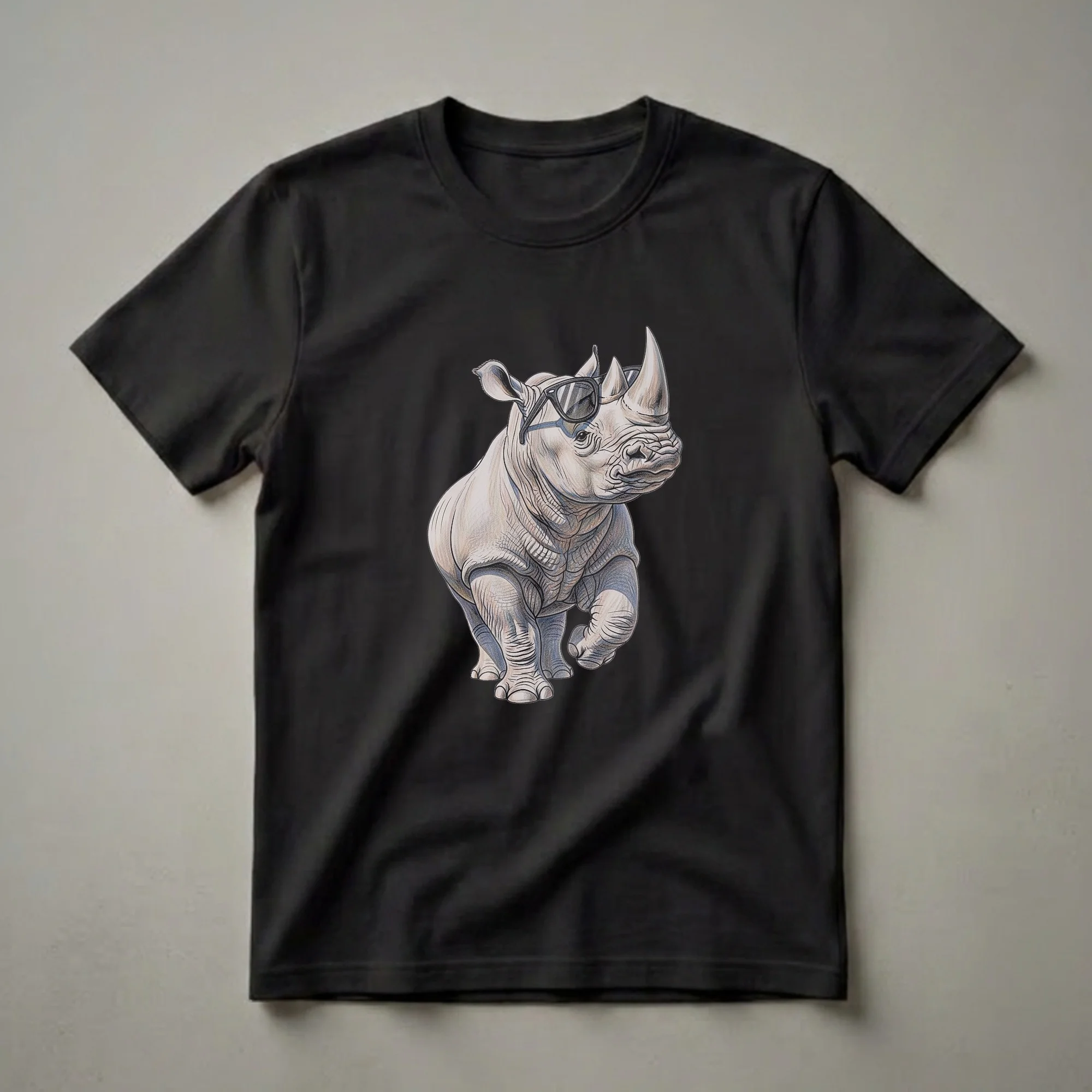 Wildlife enthusiasts who appreciate the unique charm of large mammals will reach for this striking graphic tee. The artwork features a detailed drawing of a rhinoceros, complete with a textured, wrinkled hide and a prominent horn, sporting a pair of cool black sunglasses. This eye-catching design captures the majestic presence of the rhino with a touch of playful personality. Rhinoceroses, known for their thick skin and powerful build, are found in parts of Africa and Asia, inhabiting grasslands, savannas, and forests. They are herbivores, spending much of their day grazing. This shirt makes a thoughtful gift for anyone who admires these incredible creatures, perhaps for a birthday or as a special surprise. It's a fantastic way to express your passion for conservation and the natural world, great to wear on casual outings, hikes, or while visiting a zoo. This t-shirt is a unique addition to any nature lover's wardrobe, offering a blend of artistic flair and appreciation for these magnificent animals.