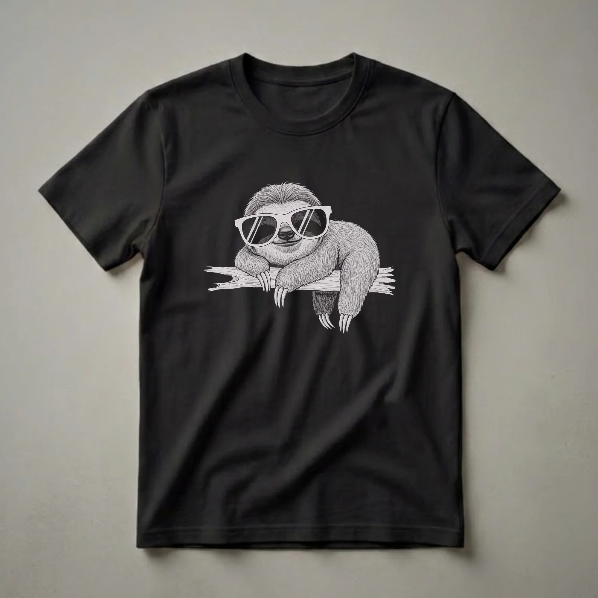 Sloth lovers who appreciate a relaxed vibe will reach for this unique graphic tee. The design features a charming, hand-drawn illustration of a three-toed sloth, complete with oversized, stylish sunglasses, casually draped over a weathered branch. This art style evokes a vintage feel, reminiscent of classic wildlife sketches. Sloths are known for their incredibly slow movements, spending most of their lives hanging upside down in the trees of Central and South American rainforests. This shirt captures that unhurried spirit, making it a go-to tee for anyone who enjoys a chill attitude. It's a thoughtful gift for friends or family who adore these fascinating mammals or simply appreciate quirky, artistic apparel. Wear this t-shirt to casual outings, nature walks, or just when you want to express your cool, unbothered persona. This comfortable shirt is a fantastic way to showcase your appreciation for wildlife and unique art, embodying a truly unhurried lifestyle.