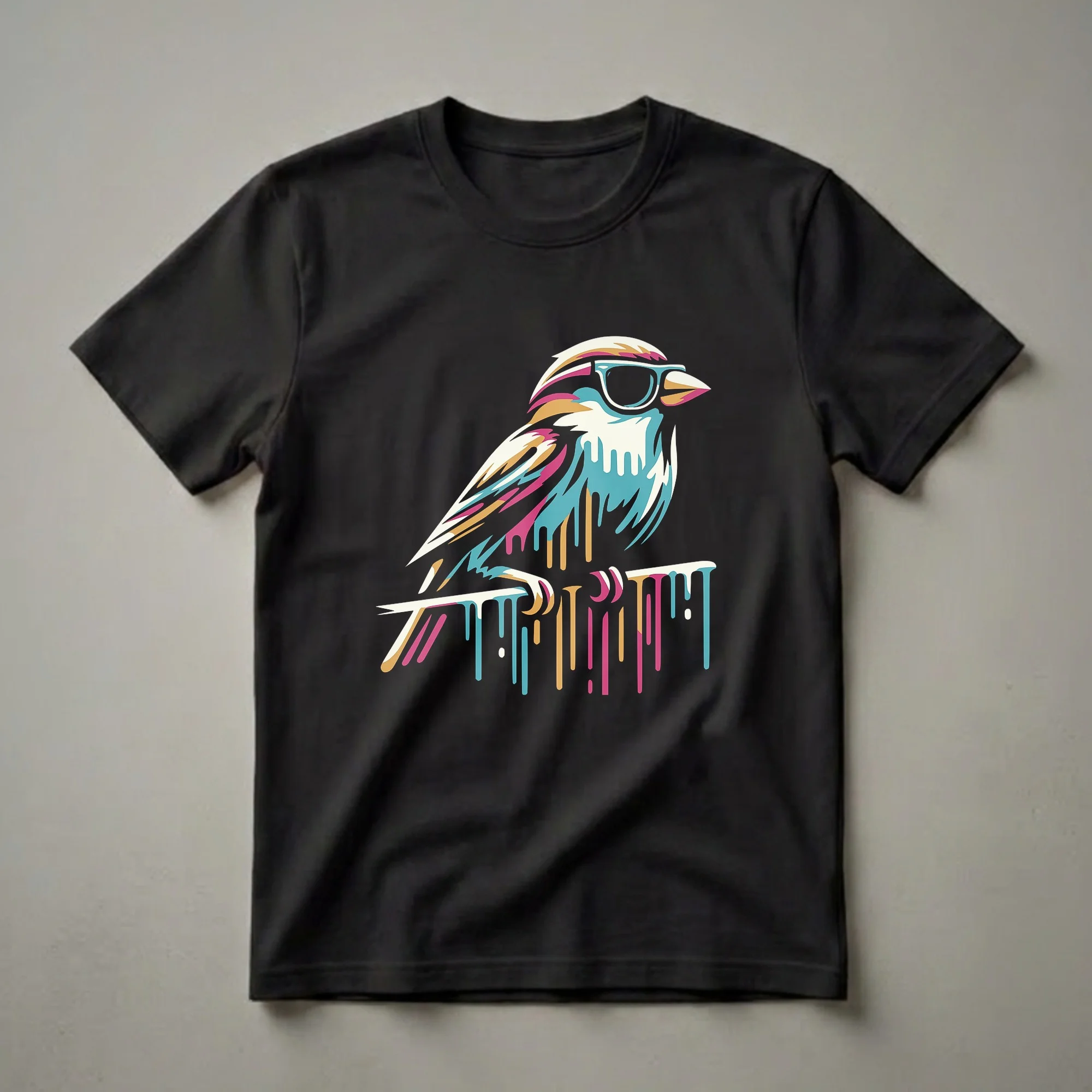 Sparrow owners and bird watchers will appreciate this eye-catching graphic tee featuring a sparrow sporting cool sunglasses. The design utilizes a vibrant geometric art style with a dripping paint effect, creating a striking visual. Sparrows, known for their adaptability and presence in urban environments, are common across continents, making this a relatable symbol for many. This t-shirt works well for casual outings, bird-watching events, or simply as a statement piece. It makes a thoughtful gift for the bird lover in your life who appreciates unique art and a touch of personality. The bold colors and modern aesthetic of this shirt ensure it stands out, offering a fun way to express a passion for avian life. Whether you're a seasoned ornithologist or simply admire the charm of these small birds, this tee is a fantastic addition to any casual wardrobe. Wear it to your next nature walk or a casual get-together with friends.