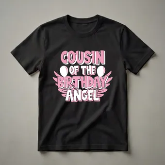 - Features bold, layered pink and white lettering announcing "COUSIN OF THE BIRTHDAY ANGEL".