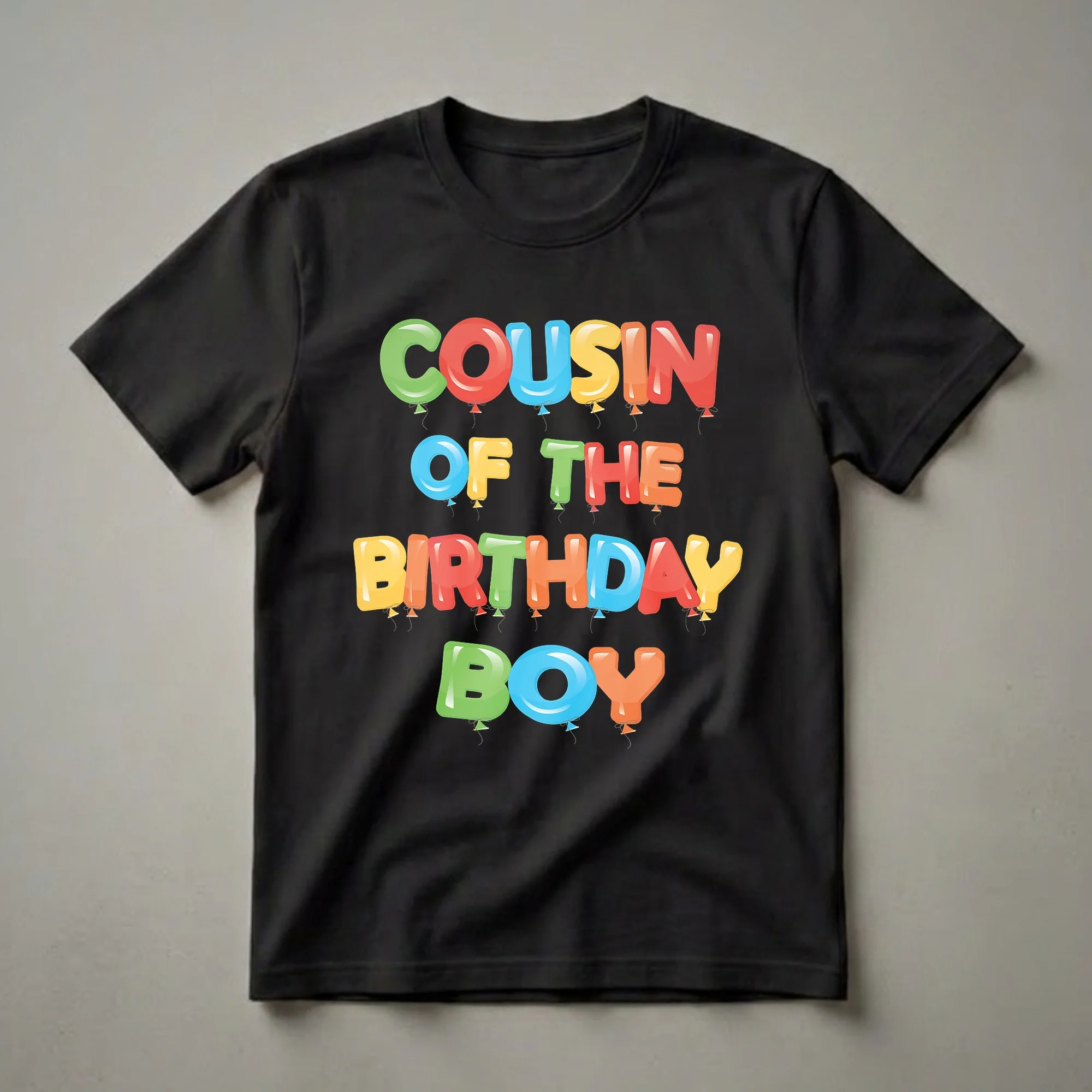 - Features bright, playful balloon letters announcing 'Cousin of the Birthday Boy'.