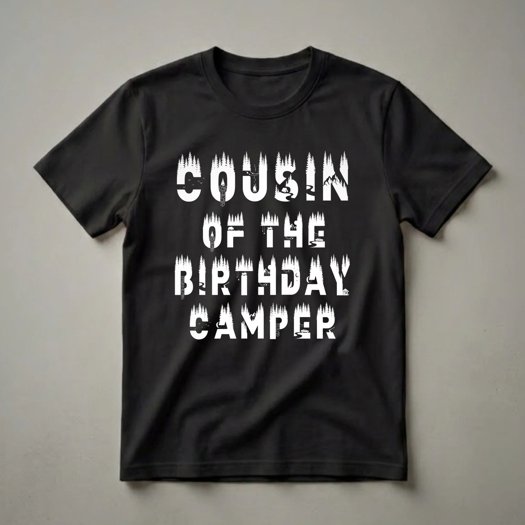 The cousin of the birthday camper will love this unique graphic tee, featuring a striking white silhouette of a forest landscape within each letter. The design showcases a variety of camping and nature elements, including pine trees, mountains, a sailboat on water, a campfire with smoke, a tent, a bison, an ATV, a car on a winding road, an axe, a wolf howling at the moon, and a small cabin. This shirt is a thoughtful gift for any cousin attending a camping-themed birthday celebration. Imagine wearing this t-shirt to a family reunion or a weekend getaway at a national park like Yosemite, where the iconic sequoia trees and granite cliffs inspire adventure. This shirt works well for anyone who enjoys the great outdoors and wants to show their connection to the birthday person's special day. It's a comfortable and stylish way to join in the birthday festivities, whether you're gathered around a campfire or exploring hiking trails. This eye-catching tee is a staple for any camping enthusiast's wardrobe, making it a go-to choice for outdoor celebrations.