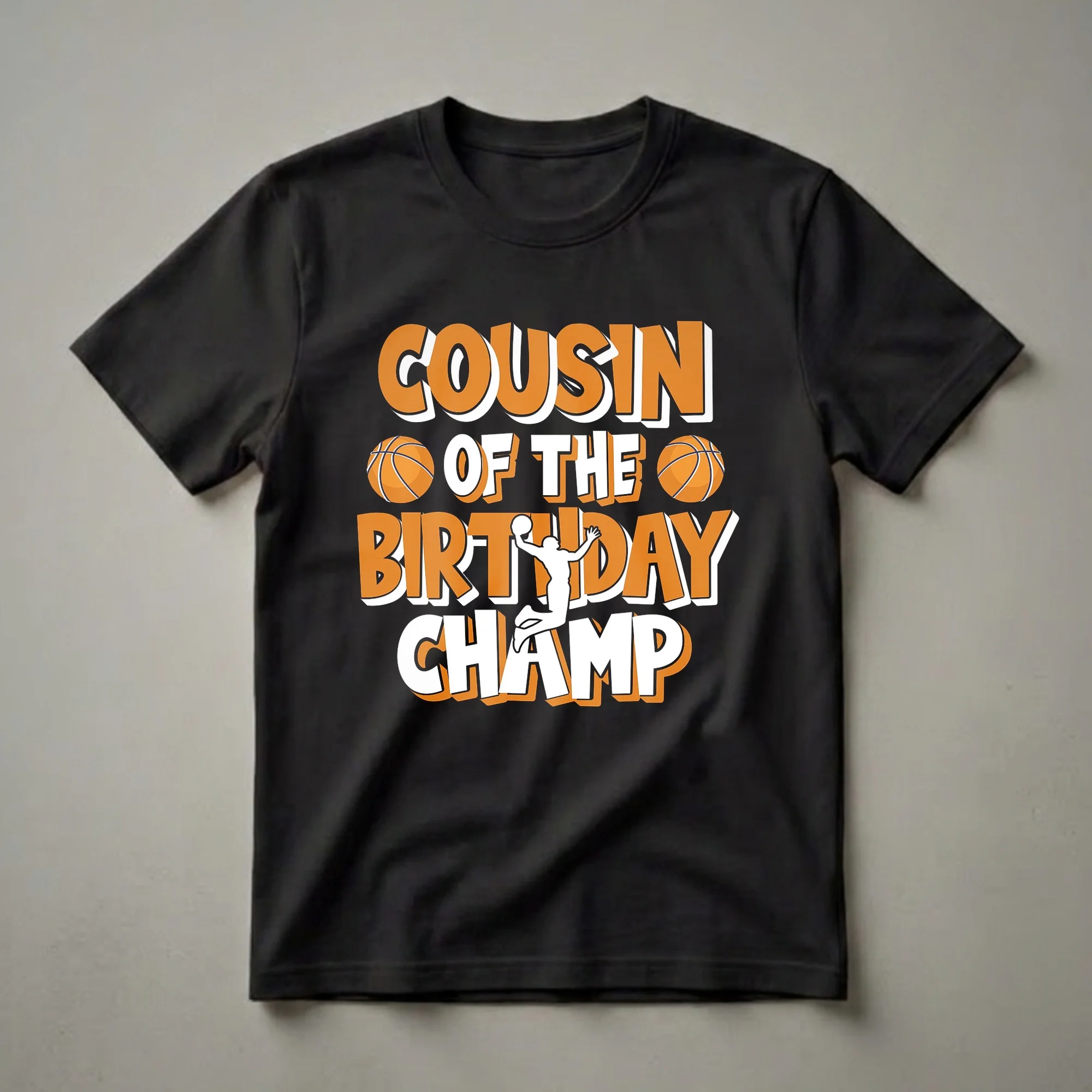 - Features a bold basketball graphic with 'Cousin of the Birthday Champ' text.