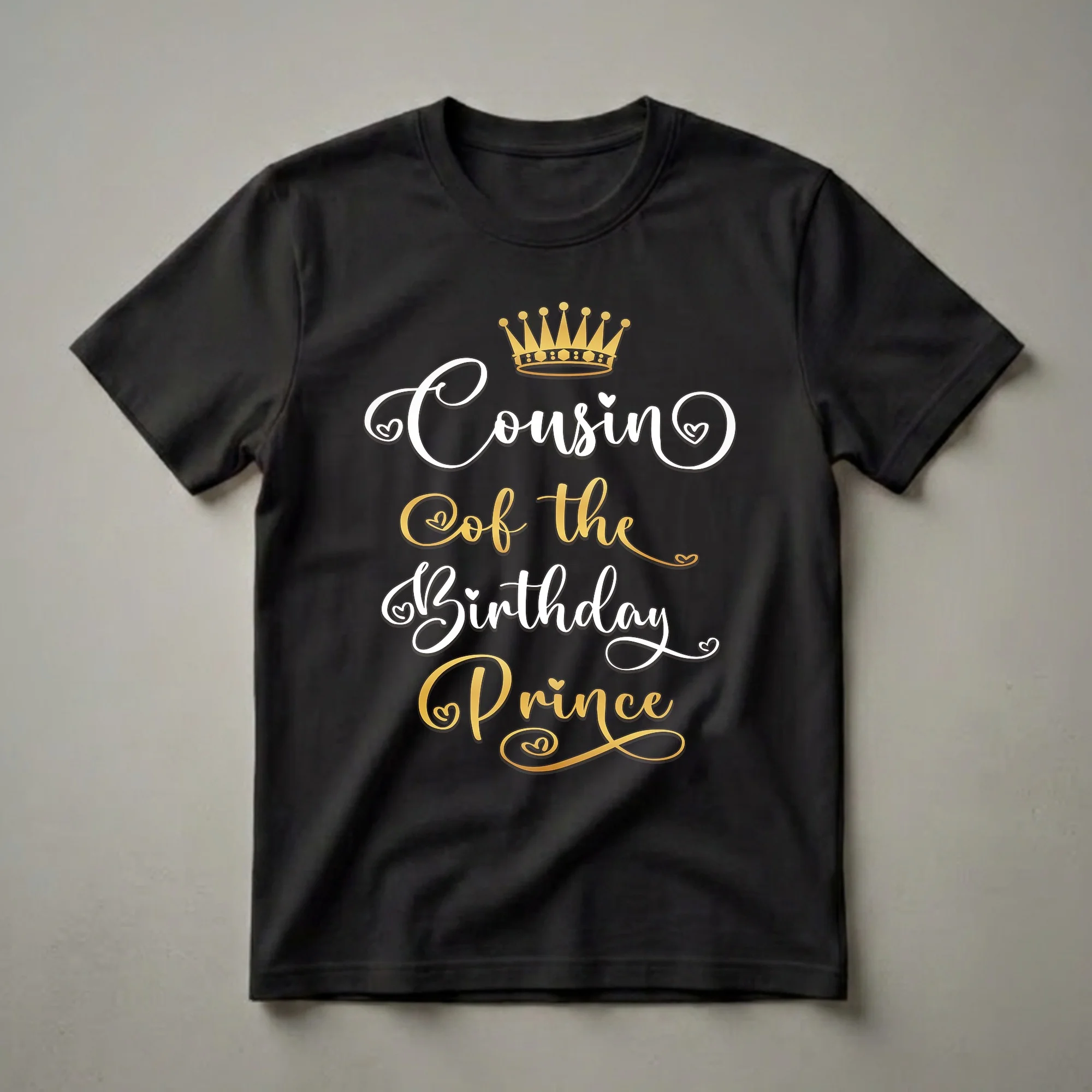 - This uniquely designed graphic t-shirt proudly declares "Cousin of the Birthday Prince" for family parties.