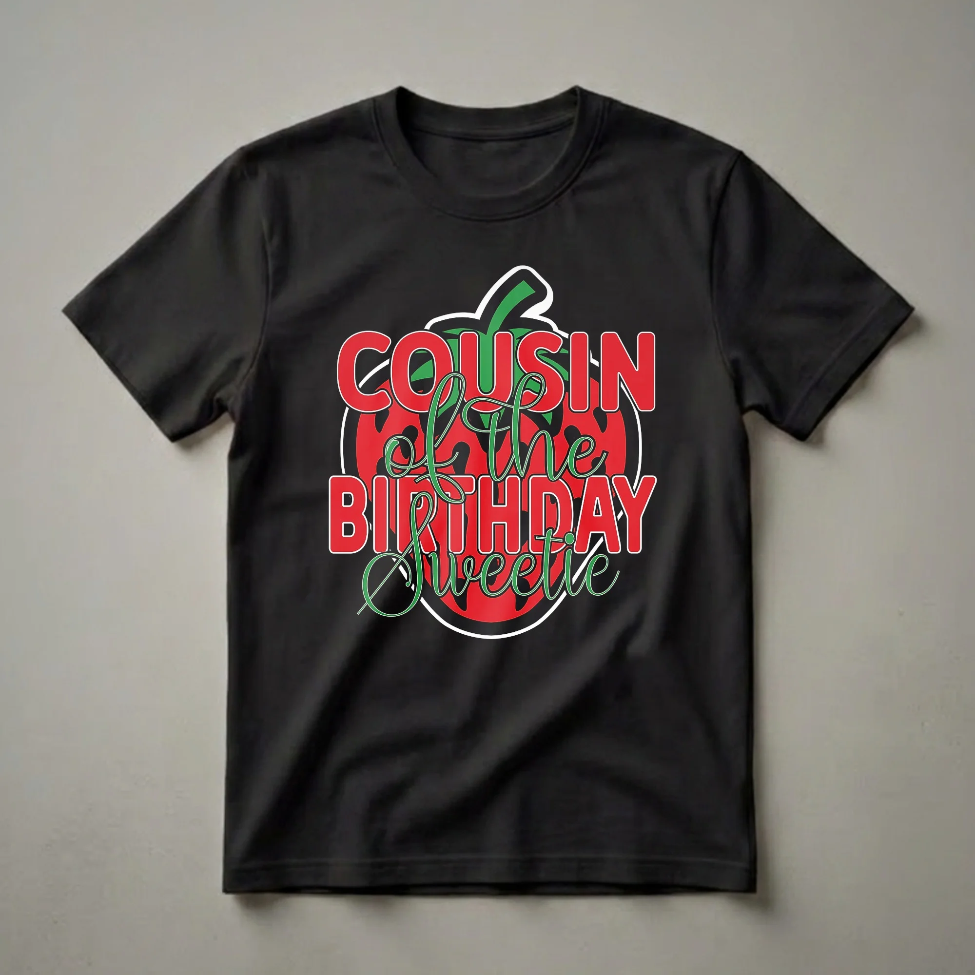 Cousins are often the closest friends, and this "Cousin of the Birthday Sweetie" tee is a vibrant way for her to show her connection to the birthday girl. The design features bold red lettering for "COUSIN" and "BIRTHDAY" with a playful green script for "of the" and "Sweetie." This text is artfully arranged around a stylized strawberry graphic, complete with a green stem and leaf accents, all set against a black background. The strawberry, a symbol of summer and sweetness, perfectly complements the celebratory theme. This shirt is a thoughtful gift for any girl attending her cousin's birthday party, making her feel special and part of the celebration. It's a fun piece of apparel that she will reach for when celebrating family milestones. Imagine her wearing this at the birthday party, adding to the festive atmosphere and showing off her special role. This graphic tee is a fantastic way for her to express her excitement and familial bond during the birthday festivities.