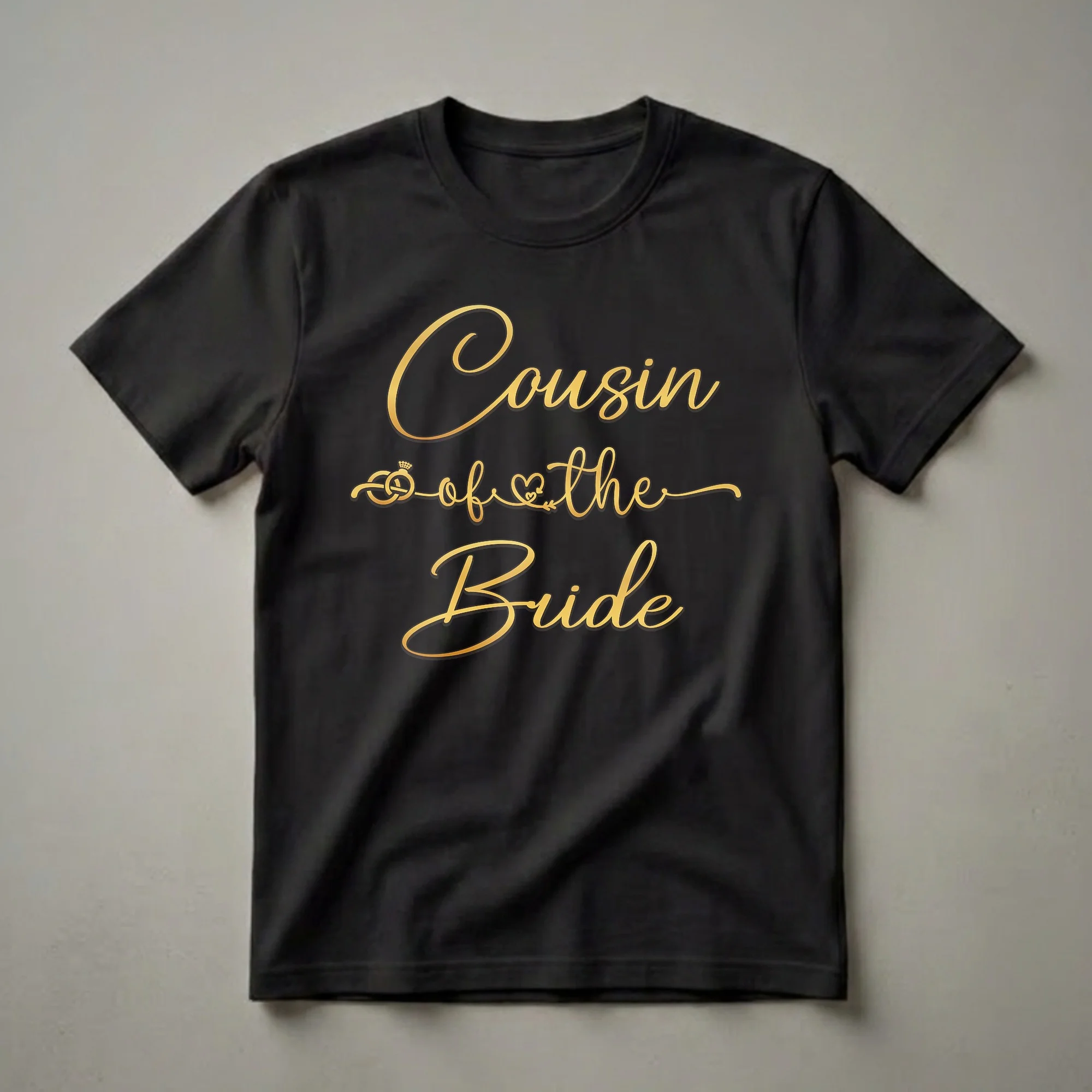 The cousin of the bride plays a special role in any wedding celebration, and this stylish tee is a fantastic way to showcase that connection. The design features elegant gold script that reads "Cousin of the Bride," with a delicate graphic of a wedding ring intertwined with a heart and subtle floral accents. This shirt is a thoughtful gift for any cousin who is excited to be part of the wedding festivities. It's a staple piece for pre-wedding events like bridal showers, engagement parties, or even casual family get-togethers leading up to the big day. Wearing this shirt allows the cousin to proudly represent her role and feel connected to the bride's journey. It's a comfortable and chic way to join in the wedding excitement and create lasting memories. This t-shirt is a go-to for any cousin looking to add a touch of personal flair to wedding celebrations. It truly makes a thoughtful gift.