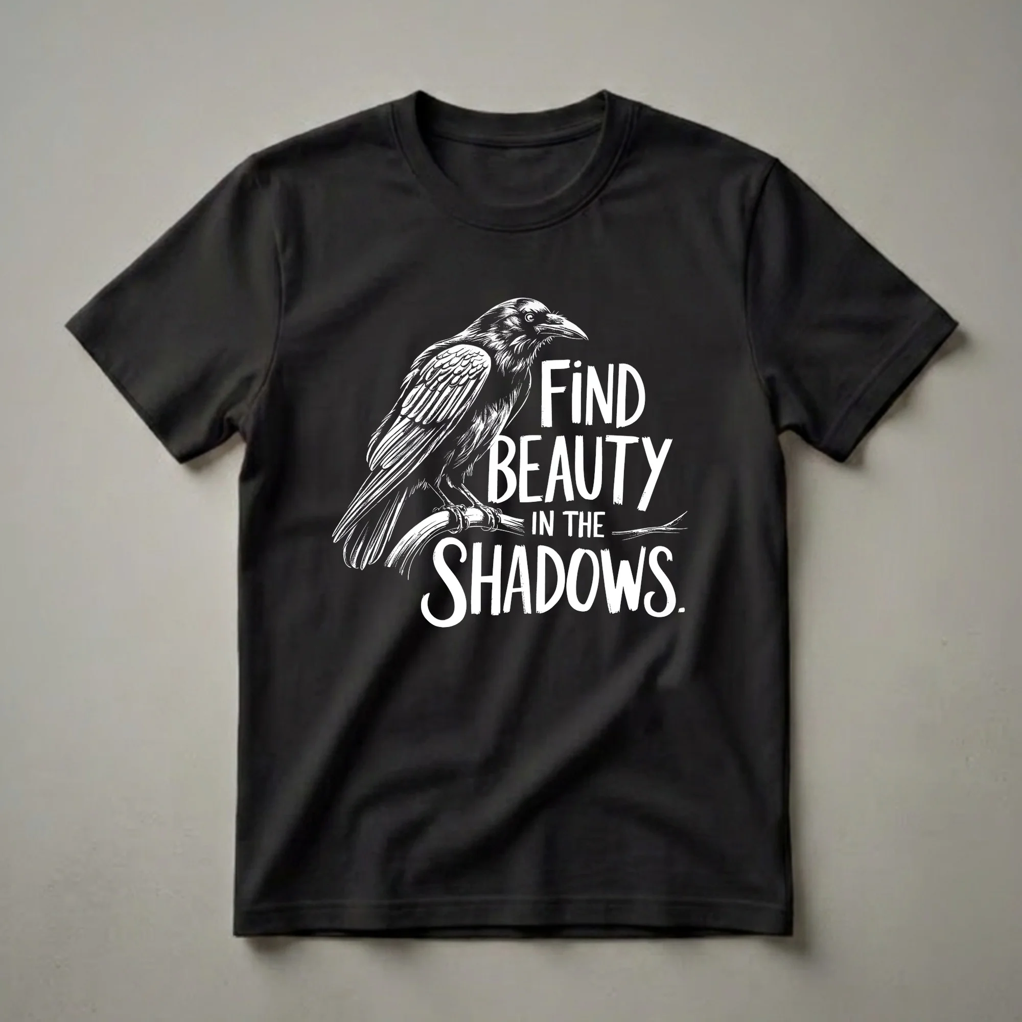 - Features a detailed illustration of a crow with the phrase 'FIND BEAUTY IN THE SHADOWS'.