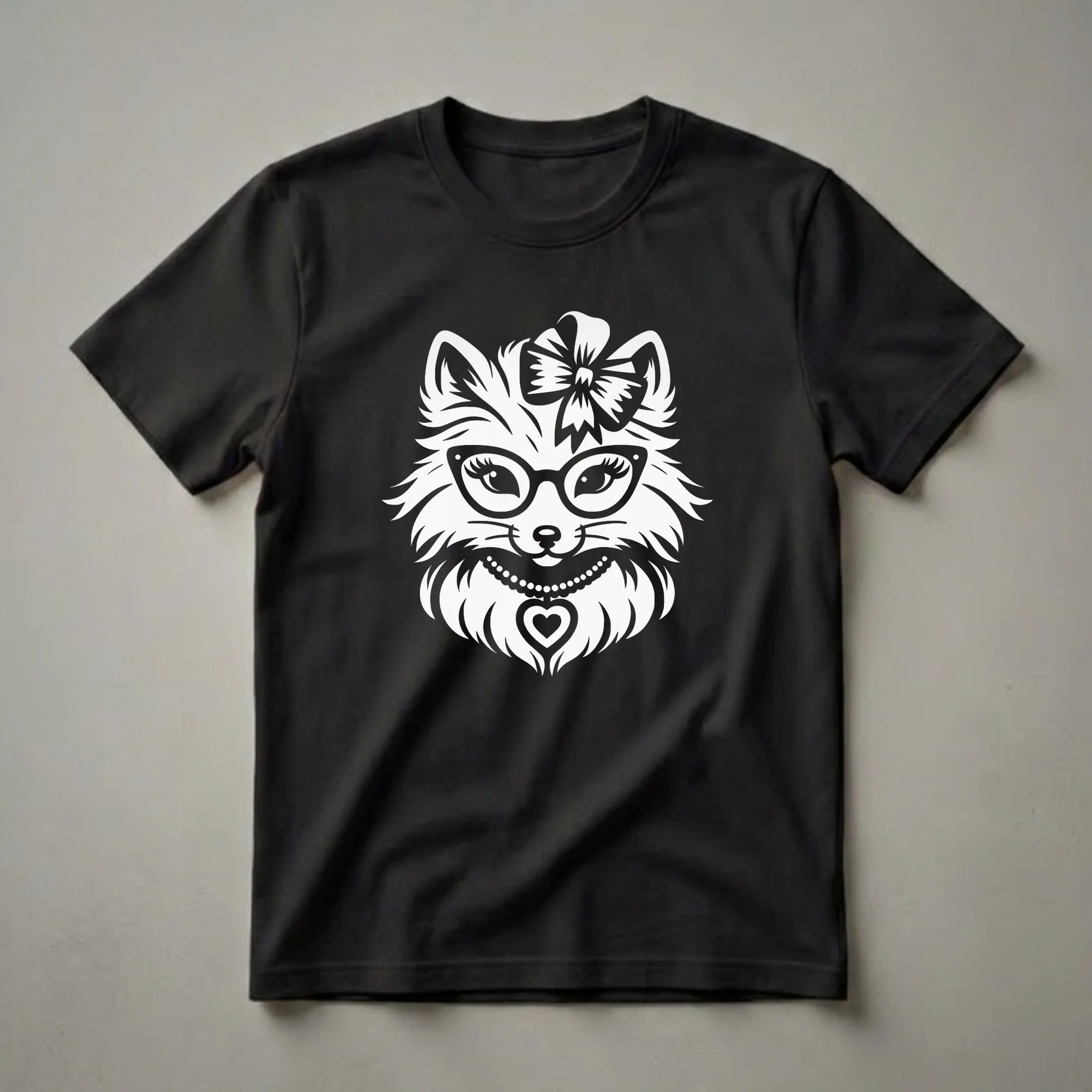 Girls and young women who appreciate the charm of arctic wildlife will reach for this eye-catching graphic tee. The design features a stylized white illustration of a fox's face, complete with large, expressive eyes behind chic black-rimmed glasses. A playful bow adorns its head, and a delicate pearl necklace with a heart-shaped pendant rests below its chin, adding a touch of whimsy. This t-shirt celebrates the unique appeal of the arctic fox, a creature known for its remarkable adaptation to cold environments and its striking white winter coat. Arctic foxes inhabit the tundra regions of the Northern Hemisphere, demonstrating incredible resilience. This shirt works well for casual outings, school days, or as a thoughtful gift for any young girl or woman who adores foxes. It's a staple in the collection for those who love animals and unique graphic apparel. Wear this tee to a casual gathering or simply to express your personal style.
