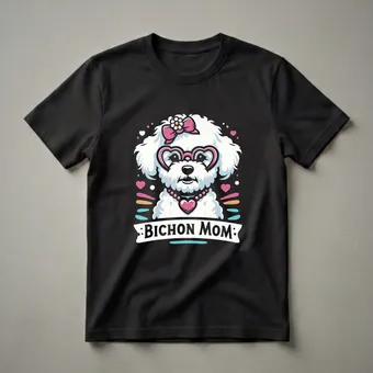 Show off your love for your adorable Bichon Frise with this charming graphic tee featuring a sweet dog in heart-shaped glasses. This eye-catching graphic tee celebrates that special bond with a charming illustration. The design features a stylized Bichon Frise, complete with a playful pink bow adorned with a flower and stylish heart-shaped glasses. A beaded necklace with a prominent pink heart pendant adds a touch of flair, perfectly complementing the dog's sweet expression. Below the illustration, the bold text 'BICHON MOM' is presented on a banner, clearly identifying the wearer's proud title. This shirt works well for everyday wear, whether you're out for a walk with your furry friend or enjoying a casual day out. It makes a thoughtful gift for any woman who cherishes her Bichon Frise, offering a fun and fashionable way to express her devotion to her beloved pet. The Bichon Frise breed, known for its cheerful disposition and hypoallergenic coat, is a beloved companion for many families, and this tee is a wonderful tribute to them.
