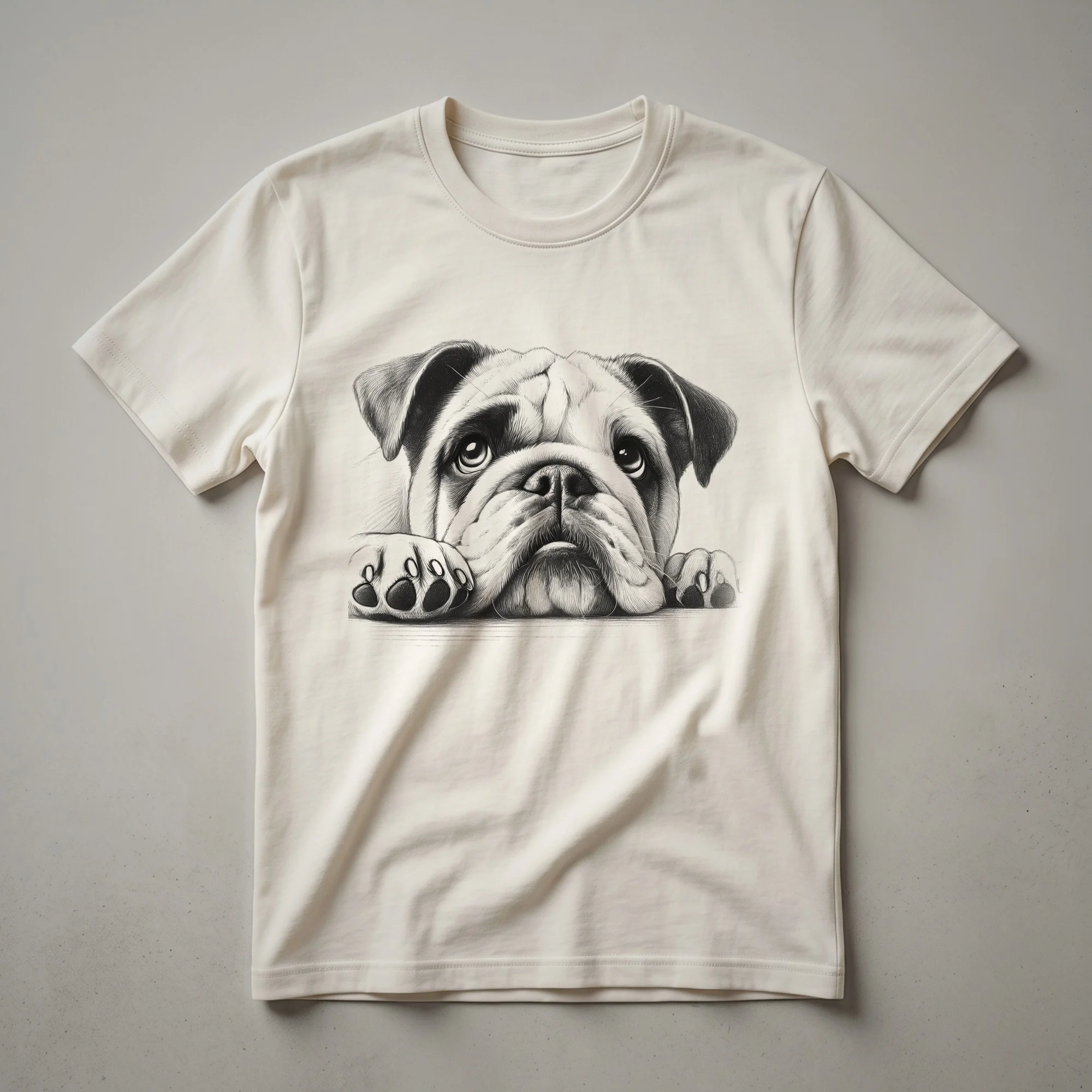 Bulldog moms and dads know the unique charm of their beloved companions. This graphic tee features a delightful bulldog face peeking over the hem, capturing the breed's endearing expression. Bulldogs, originating from England, were initially bred for bull-baiting but are now cherished for their gentle, affectionate nature and distinctive appearance. This shirt is a staple for any dog owner who appreciates the loyalty and character of their four-legged family member. It makes a thoughtful gift for the bulldog enthusiast in your life, a thoughtful choice for casual outings, dog park visits, or simply relaxing at home. Wear this eye-catching t-shirt to express your passion for these lovable dogs and spark conversations with fellow admirers. It's a go-to tee for anyone who can't get enough of their wrinkly-faced friend.
