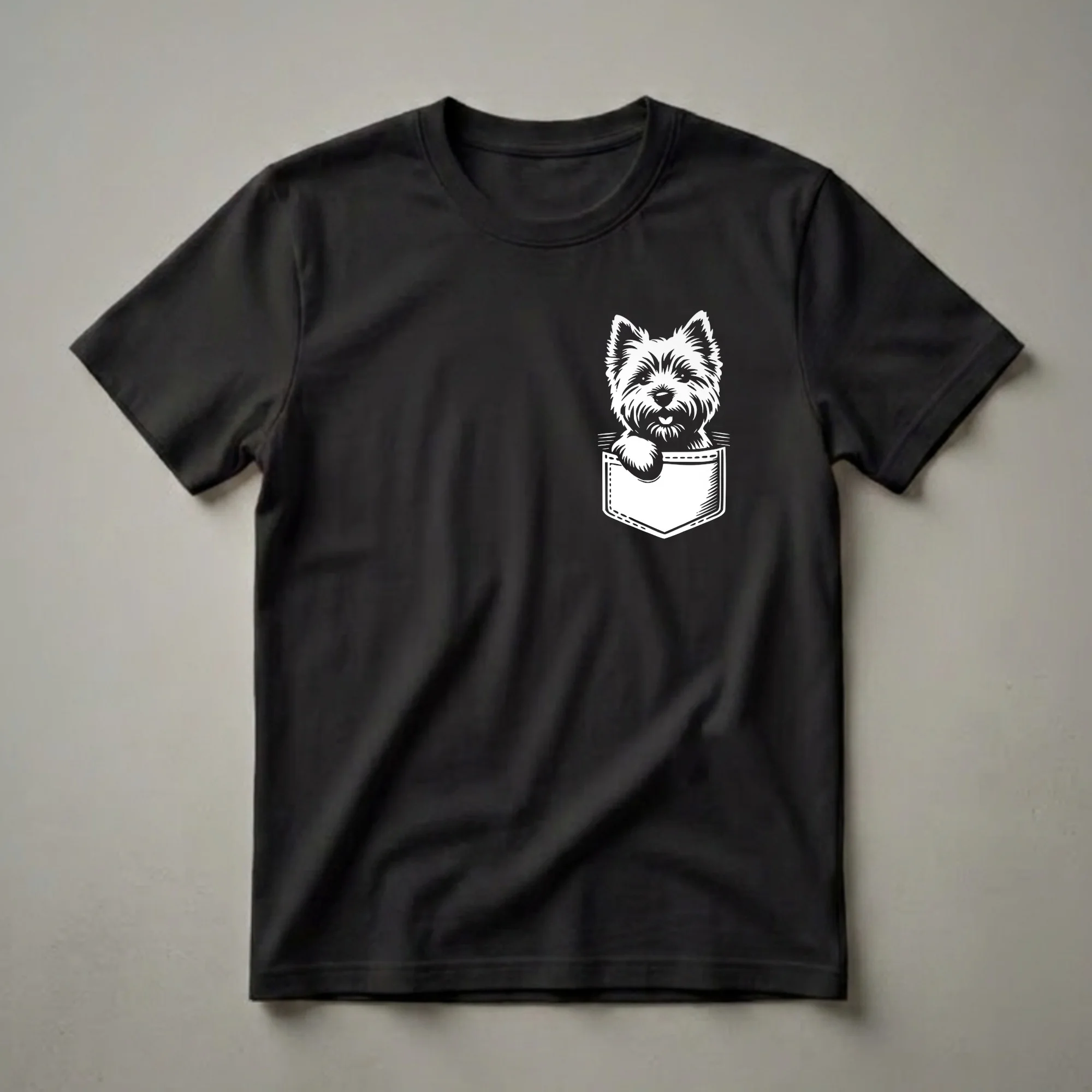 Showcase your love for spirited Cairn Terriers with this adorable graphic tee, featuring a playful pup peeking from a pocket. This graphic tee captures that charm with a playful design featuring a white Cairn Terrier peeking out from a stylized pocket. The stark black background of the shirt makes the white graphic pop, creating an eye-catching visual that dog lovers will appreciate. Cairn Terriers, originally from the Scottish Highlands, are known for their agility and curious nature, traits that seem to shine through the dog's expressive face in this artwork. This t-shirt is a wonderful way for any Cairn Terrier mom or dad to display their affection for their furry companion. It makes a thoughtful gift for birthdays, holidays, or just because for the dog enthusiast in your life. Wear this shirt to casual outings, dog park visits, or simply while relaxing at home with your beloved pet. It's a staple in the collection for anyone who adores this lively breed.