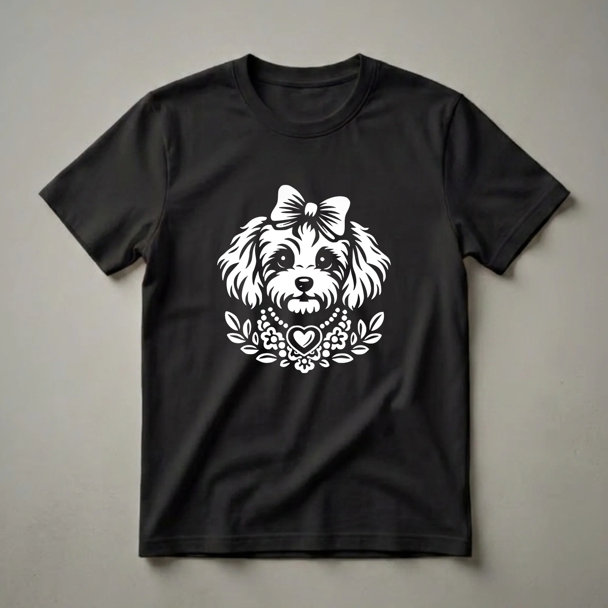 Cavapoo owners who adore their fluffy companions will reach for this charming graphic tee. The design features a stylized white illustration of a Cavapoo's head, complete with a playful bow perched atop its head and a delicate necklace adorned with flowers and a heart pendant. Cavapoos, a crossbreed between a Cavalier King Charles Spaniel and a Poodle, are known for their friendly disposition and intelligence, making them a beloved choice for families and individuals alike. This shirt captures that affectionate spirit. It's a thoughtful gift for any woman who cherishes her Cavapoo, whether it's for a birthday, holiday, or just because. Imagine wearing this eye-catching t-shirt to your next dog park visit or casual outing with friends. This unique shirt is a wonderful way to express your passion for your furry best friend and celebrate the joy they bring into your life. The intricate details of the floral elements and the central heart pendant add a touch of sweetness to the overall design, making it a standout piece for any dog lover's wardrobe.