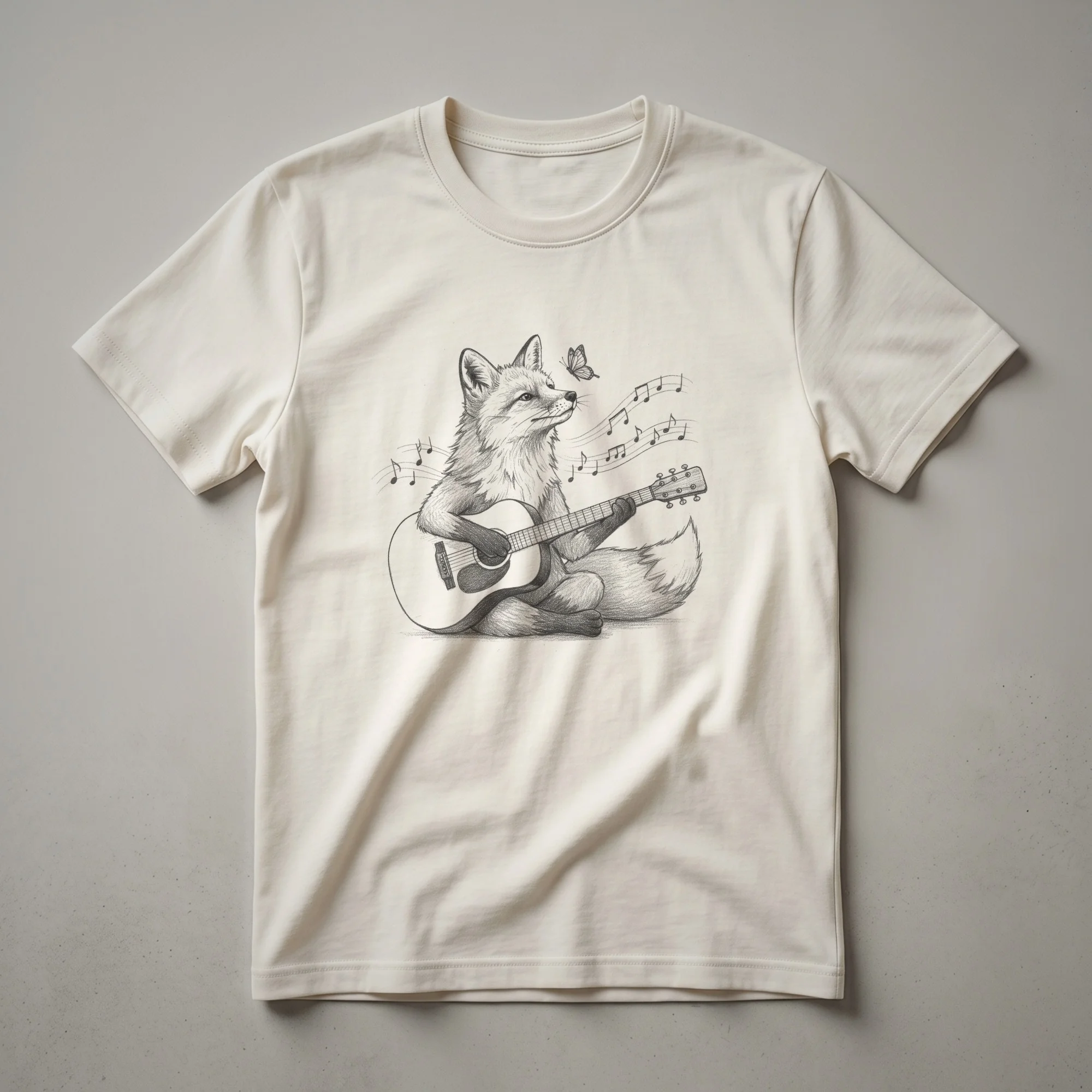 - Graphic t-shirt featuring a cute fox playing a guitar with butterflies.