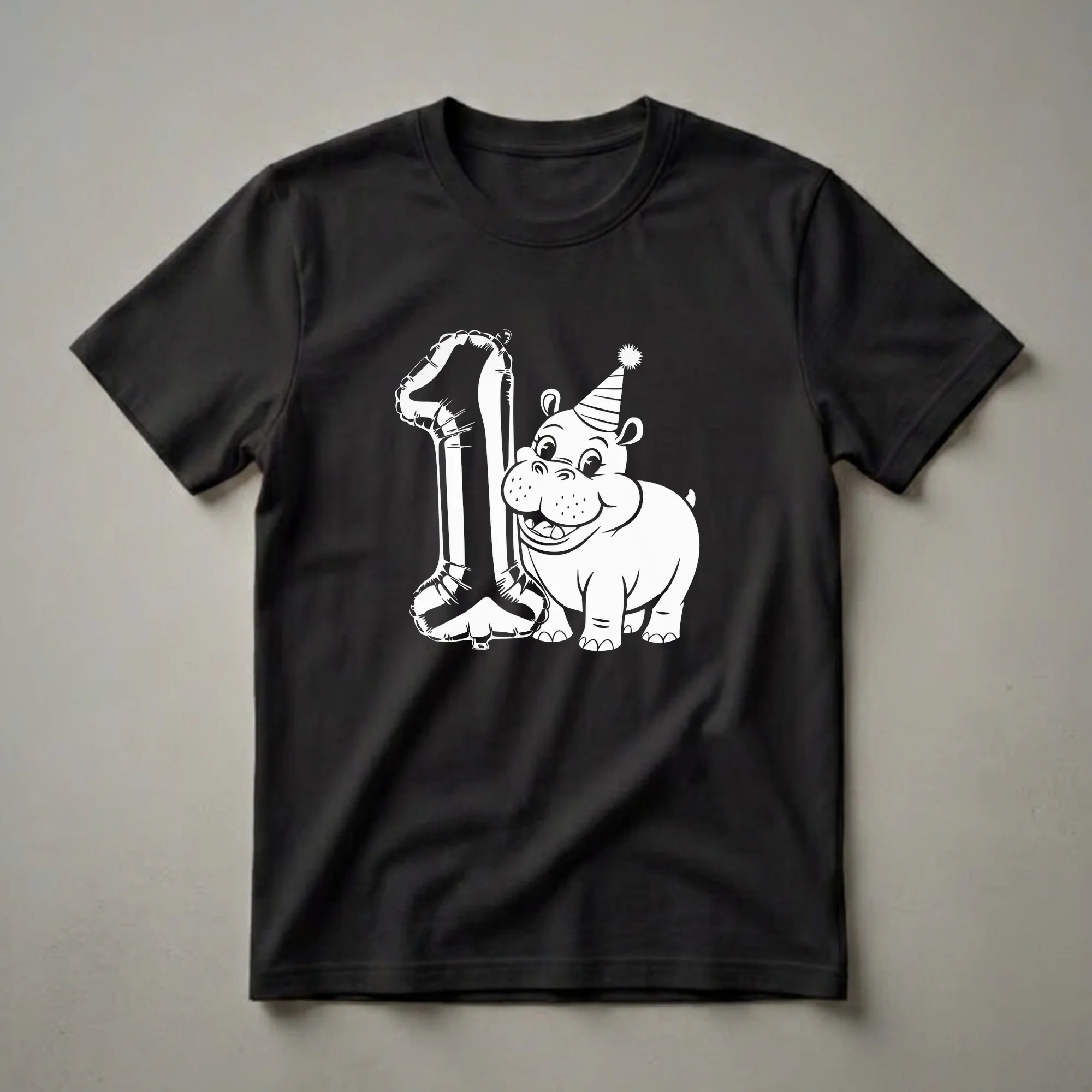 Celebrate your little one's very first birthday surrounded by adorable woodland creatures with this sweet hippo and balloon graphic tee. The design features a friendly, cartoon hippo character adorned with a festive striped party hat, complete with a fluffy pom-pom on top. Beside the cheerful hippo stands a large, inflated balloon shaped like the number '1', symbolizing the big day. Hippos, known for their social nature and surprisingly agile movements in water, are often a favorite among young children. This t-shirt is a delightful way to commemorate a child's first year. It's a thoughtful gift for any parent looking for a special outfit for their little one's birthday party, cake smash photo session, or any festive gathering. This shirt is sure to bring smiles and make the birthday boy or girl feel extra special as they explore the world around them during this exciting developmental stage. The playful imagery makes this tee a go-to choice for celebrating this significant age.