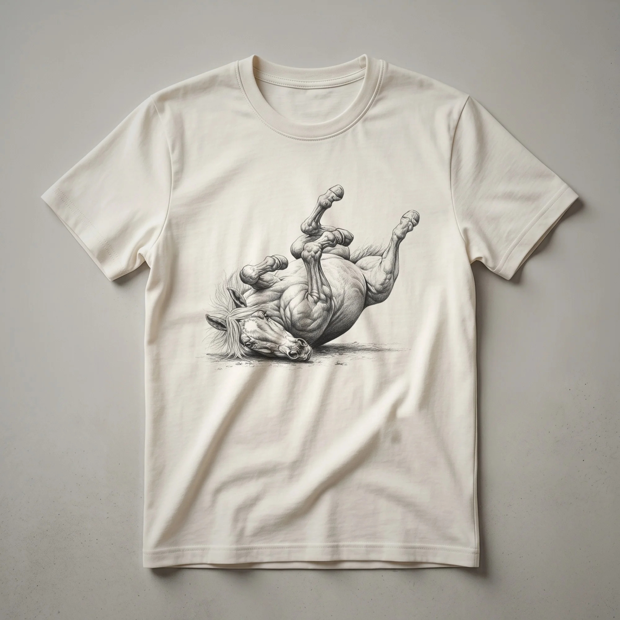 Horse lovers will adore this charming graphic tee featuring a playful horse rolling in the grass. The design captures the pure joy and freedom horses experience, often seen when they roll to scratch an itch or simply revel in their surroundings. This t-shirt is a wonderful way for any equestrian or admirer of these magnificent animals to express their passion. Horses, known for their strength, grace, and companionship, have been integral to human history for millennia, serving as partners in work, sport, and travel. This shirt is a thoughtful gift for the horse mom, dad, or rider in your life who understands the special bond between humans and equines. It's a staple in any casual wardrobe, great to wear to the stable, to a horse show, or simply while relaxing at home. Let this eye-catching design be a conversation starter among fellow horse enthusiasts, celebrating the simple pleasures of these noble creatures. This comfortable shirt makes a thoughtful gift for any collection.