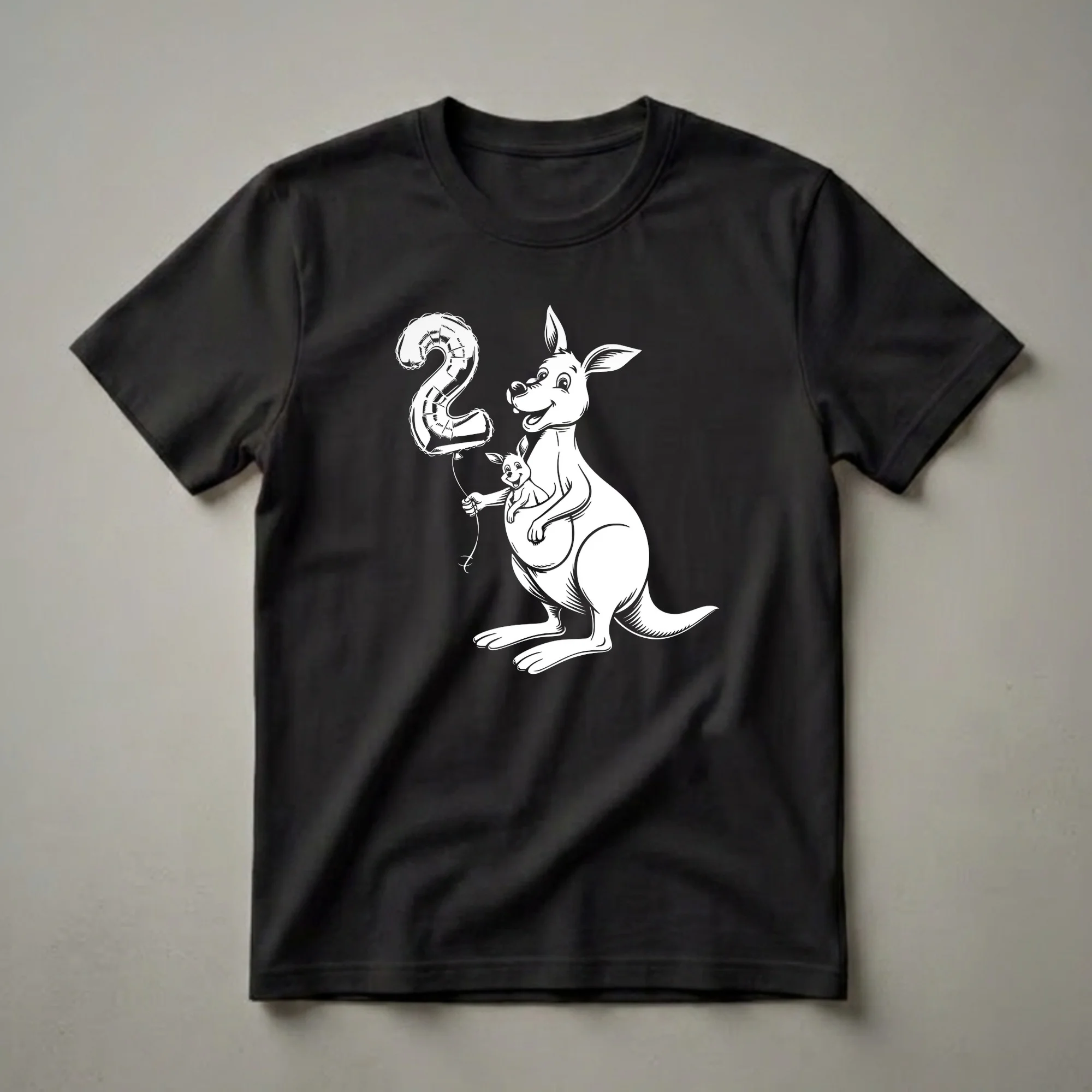 Two-year-olds are exploring the world with boundless energy, and this charming kangaroo t-shirt captures that spirit of discovery. The graphic features a friendly kangaroo, complete with a joey peeking from its pouch, joyfully holding a large, shiny balloon shaped like the number '2'. This design is a delightful way to commemorate a special second birthday milestone. Kangaroos, native to Australia, are known for their powerful hind legs and their unique way of carrying their young in a pouch, a feature that makes this design particularly endearing for young children. This tee works well for any child celebrating their second birthday, whether it's a small family gathering or a larger party. It makes a thoughtful gift for a niece, nephew, grandson, or granddaughter who is turning two. Imagine their delight when they see this playful marsupial ready to celebrate with them. This shirt is a fun choice for birthday photos or for everyday wear, bringing a smile to everyone who sees it. It’s a wonderful way to make a 2-year-old feel extra special on their big day.