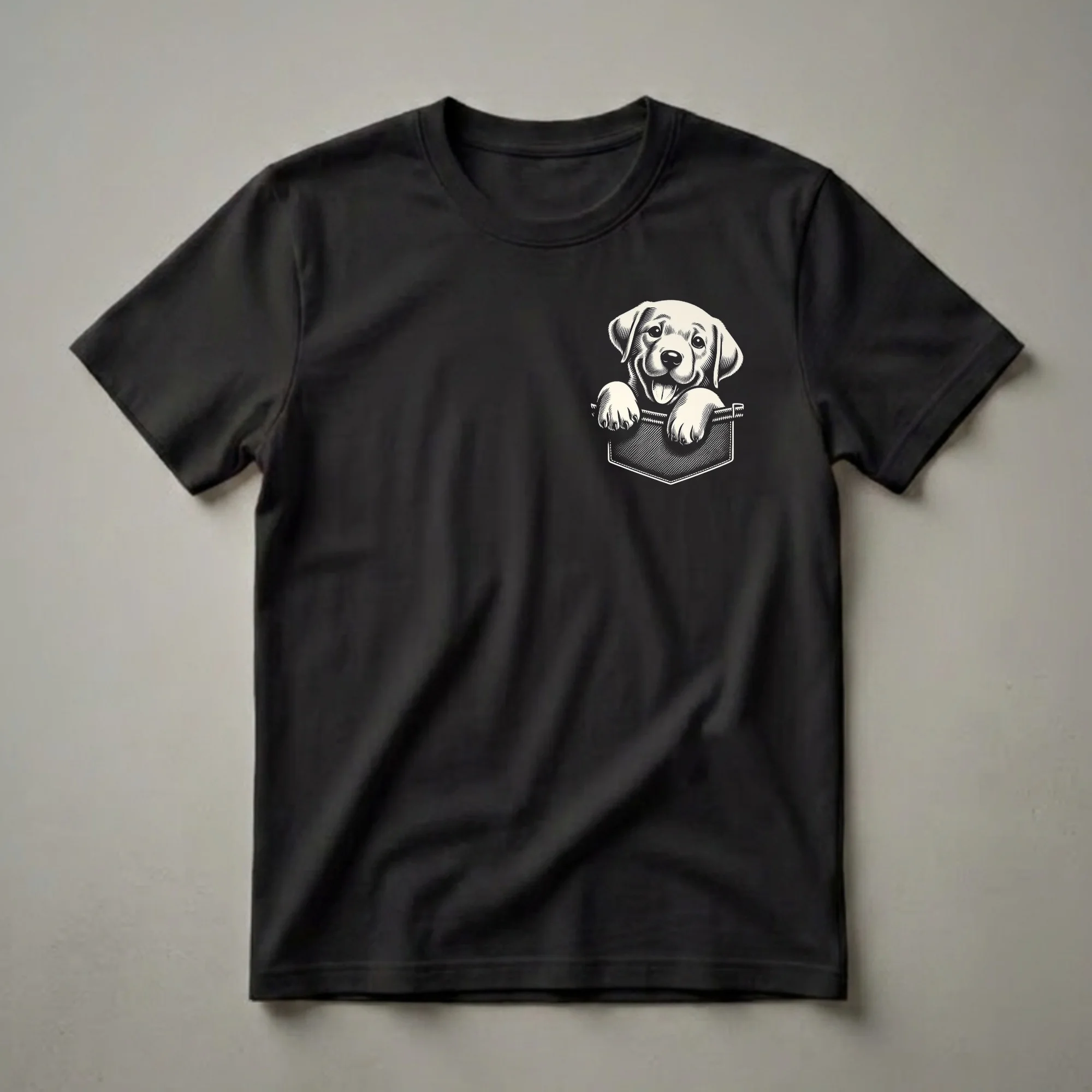 Labrador Retriever moms and dads know the joy a playful puppy brings into their lives. This eye-catching graphic tee features a charming Labrador Retriever puppy peeking over the edge of a pocket, rendered in a classic black and white illustration style. The puppy's happy expression and lolling tongue capture the breed's famously friendly and enthusiastic nature. Labrador Retrievers are renowned for their intelligence and eagerness to please, making them one of the most popular dog breeds worldwide. This t-shirt is a delightful way for any Labrador enthusiast to express their affection for their furry companion. It makes a thoughtful gift for birthdays, holidays, or just because for the dog lover in your life. Wear this shirt to your next dog park visit or casual outing and let your love for Labs shine through.