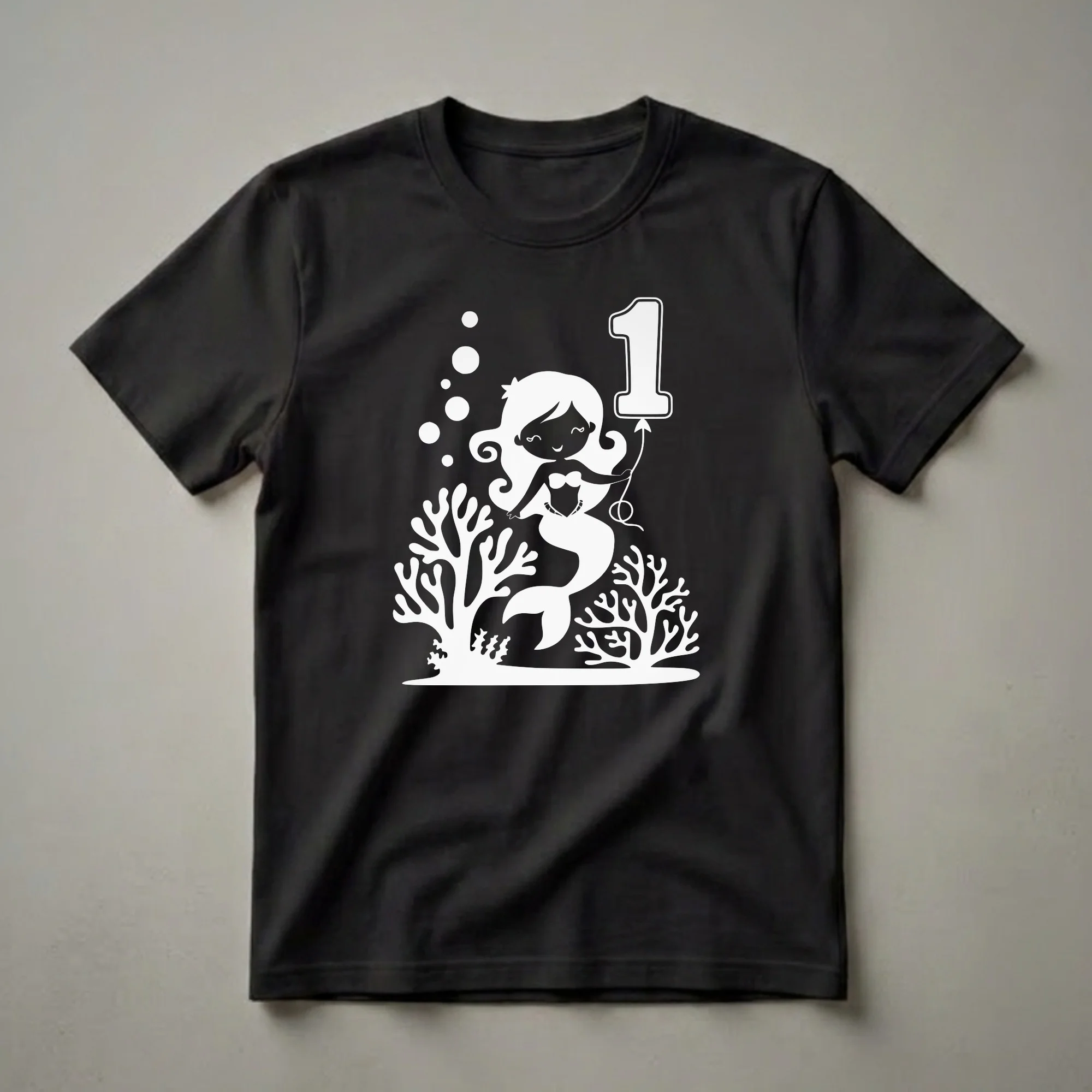 Turning one is a magical milestone, and this charming mermaid t-shirt is a delightful way to celebrate your little one's special day. The graphic showcases a whimsical cartoon mermaid with flowing hair, a seashell bikini top, and a shimmering tail, all rendered in a clean white silhouette against a dark background. She joyfully holds a large balloon shaped like the number '1', symbolizing this significant first birthday. Surrounding her are playful bubbles and intricate coral formations, evoking an enchanting underwater scene. This t-shirt is a thoughtful gift for any parent looking to make their daughter's first birthday party memorable. It's a sweet keepsake that captures the wonder of childhood and the magic of mermaids. Imagine her wearing this tee for her birthday photos or cake smash session, creating cherished memories. This shirt is a go-to for any under-the-sea themed celebration, making her feel like a true birthday princess. The vibrant underwater elements and the cheerful mermaid make this shirt a standout piece for any little girl's celebration.
