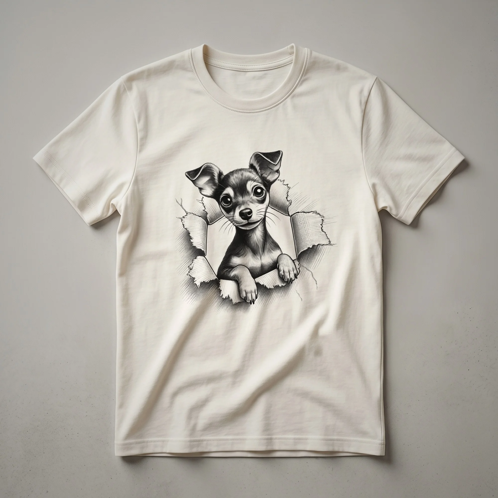 Min Pin owners who adore their spirited and alert companions will reach for this charming t-shirt. The design features a playful Miniature Pinscher, also known as a Min Pin, peeking over the bottom edge of the shirt. This breed, originating from Germany, is known for its distinctive appearance and confident personality, often described as a 'king of toys'. The graphic captures the breed's curious nature with its alert ears and expressive eyes. This tee is a thoughtful gift for any Miniature Pinscher mom or dad, celebrating their bond with their energetic canine friend. It's a great way to express your affection for this unique dog breed, whether you're out for a walk in the park or enjoying a casual day at home. The simple yet eye-catching design makes it a versatile addition to any dog lover's wardrobe, sparking conversations and smiles among fellow enthusiasts. This shirt is a staple for anyone who cherishes their Min Pin's lively spirit and distinctive charm.