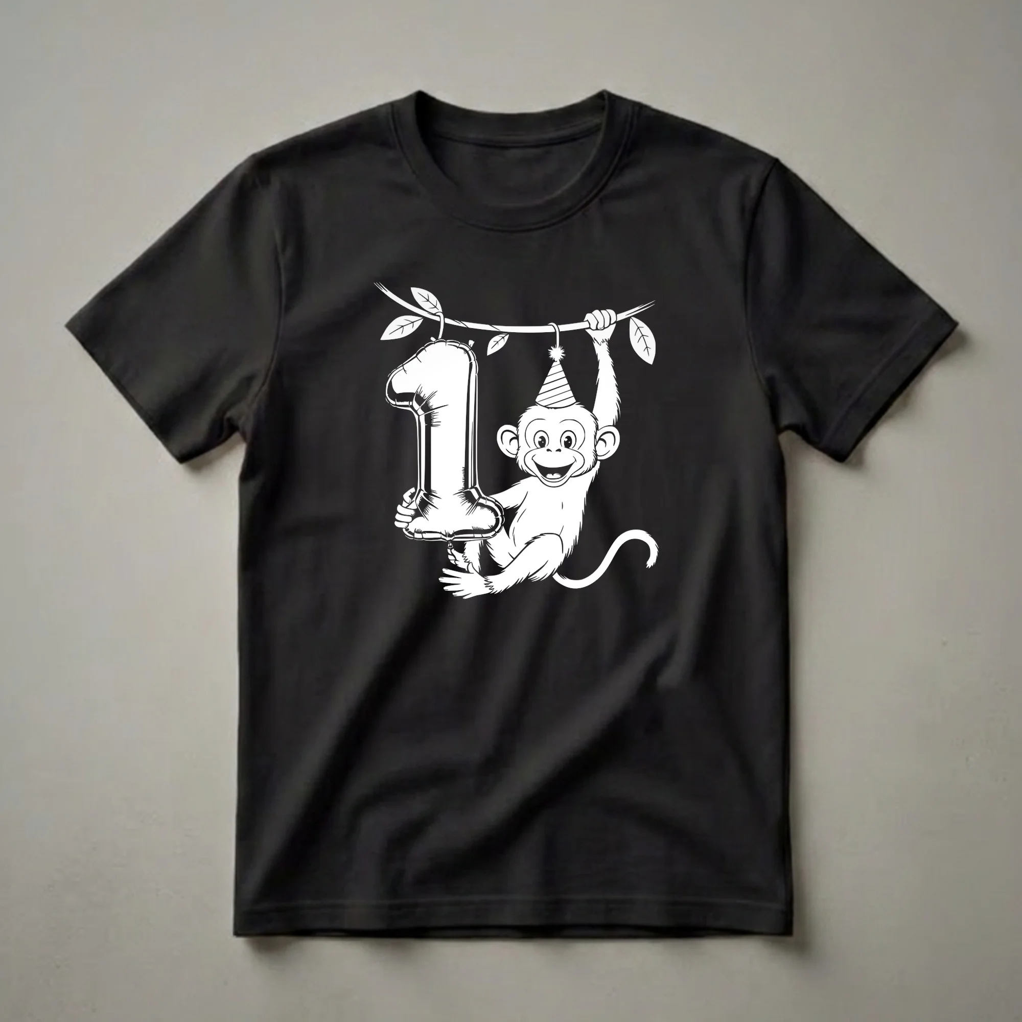 One-year-olds are embarking on their incredible journey of discovery, and this playful monkey graphic tee captures that spirit of adventure. This eye-catching design features a cheerful monkey, complete with a festive party hat, swinging from a branch. It proudly holds a large, shiny balloon shaped like the number '1', symbolizing this significant milestone. Monkeys, known for their agility and playful nature, are a fitting motif for a child's first birthday. This t-shirt is suited for toddlers celebrating their very first birthday, making it a wonderful addition to their special day. Imagine the joy on your little one's face as they wear this shirt for their birthday party, cake smash, or family photos. It’s a thoughtful gift for parents looking for a unique and memorable outfit for their child's first birthday celebration. This shirt is a delightful way to commemorate a child turning one, offering a fun and memorable keepsake for years to come. The simple yet striking black and white line art style ensures the design pops, making it a standout piece for any little explorer's wardrobe.