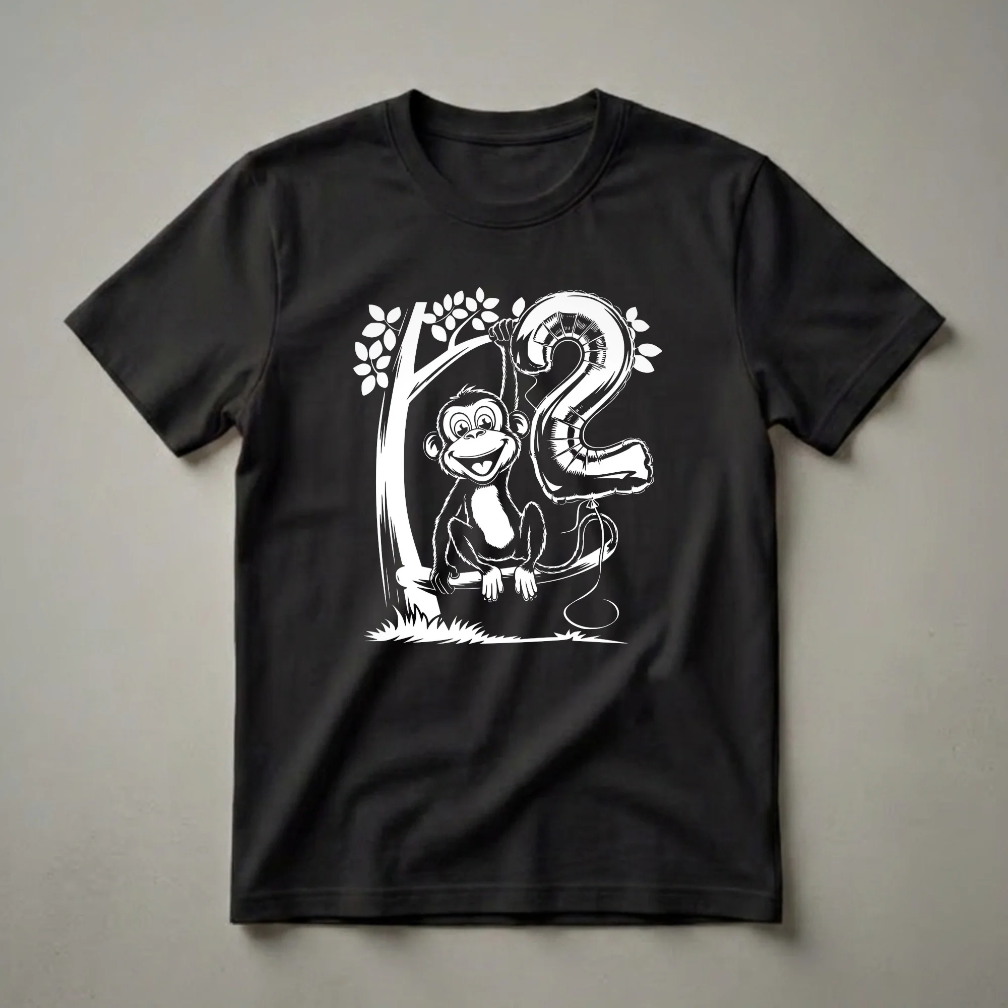 Two-year-olds are entering a vibrant stage of exploration and play, and this cheerful monkey graphic tee perfectly captures that playful spirit. The design features a whimsical cartoon monkey, rendered in crisp white line art against a dark background, swinging from a tree branch. In its hand, the monkey joyfully clutches a large, inflated balloon shaped like the number '2', symbolizing the special birthday milestone. This eye-catching t-shirt is a delightful way to commemorate a child's second birthday. Monkeys, known for their agility and playful nature, are often associated with fun and adventure, making them a fantastic theme for a toddler's celebration. This shirt works well for a birthday party, a casual day out, or as a thoughtful gift for a special two-year-old. Imagine the smiles this shirt will bring as the birthday child celebrates turning two, perhaps at a zoo visit or a jungle-themed party. This graphic tee is sure to become a favorite piece of apparel for any little one celebrating this exciting age. It's a wonderful way for parents or grandparents to mark the occasion with a unique and memorable gift.