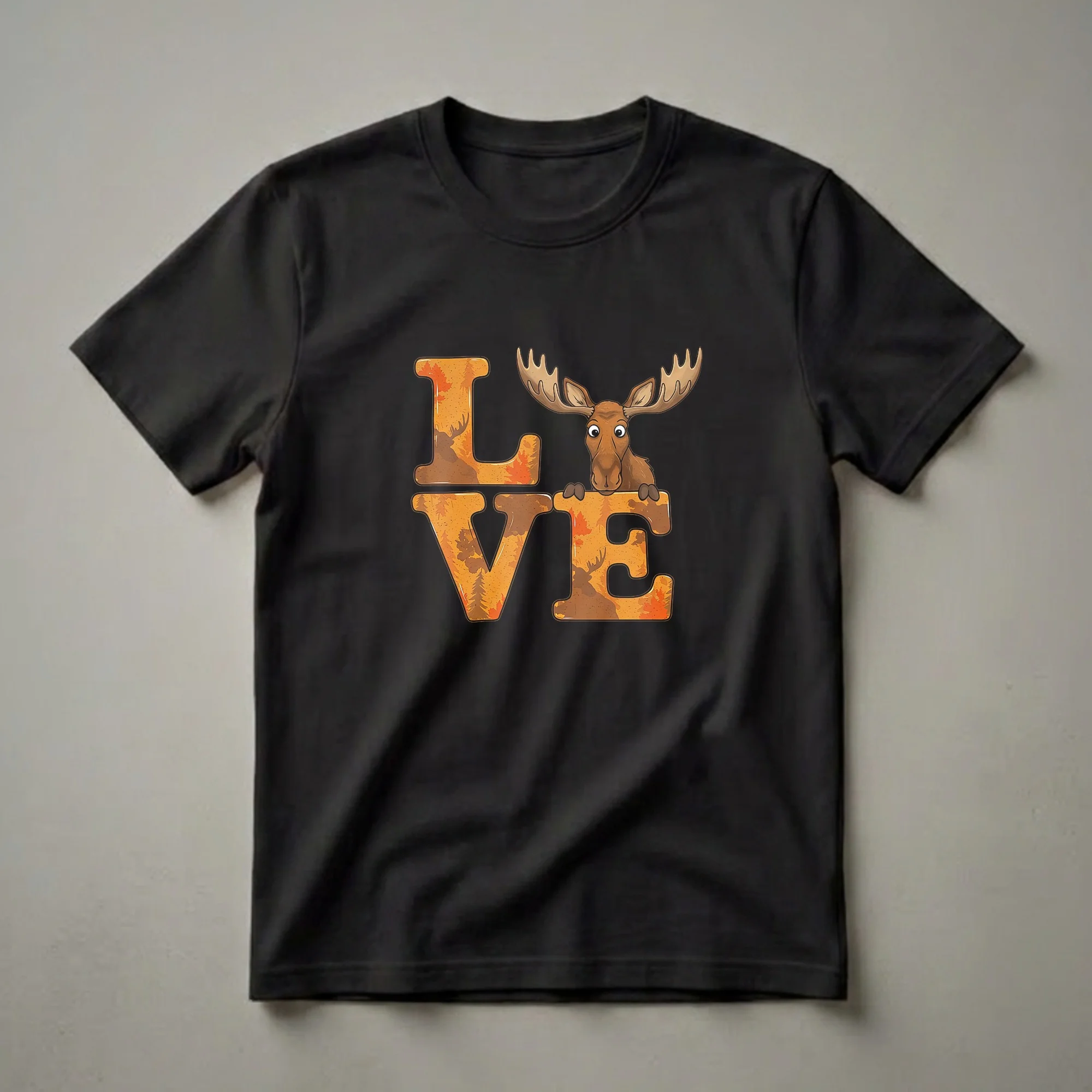 Wildlife enthusiasts who appreciate the majestic moose will reach for this eye-catching graphic tee. The design features the word 'LOVE' rendered in bold, warm orange letters, filled with a charming autumn woodland scene. Silhouettes of pine trees and vibrant maple leaves create a cozy, rustic backdrop. Peeking over the top of the 'O' and 'V' is a friendly, cartoon-style moose with wide, curious eyes and impressive antlers. Moose, the largest members of the deer family, are known for their solitary nature and preference for boreal forests and temperate broadleaf and mixed forests across North America and Eurasia. This shirt is a wonderful way for any nature lover, hiker, or admirer of woodland creatures to express their passion. It makes a thoughtful gift for someone who cherishes the great outdoors or dreams of spotting these magnificent animals in their natural habitat. Wear this t-shirt on your next nature walk, to a casual gathering, or simply when you want to carry a piece of the wild with you.